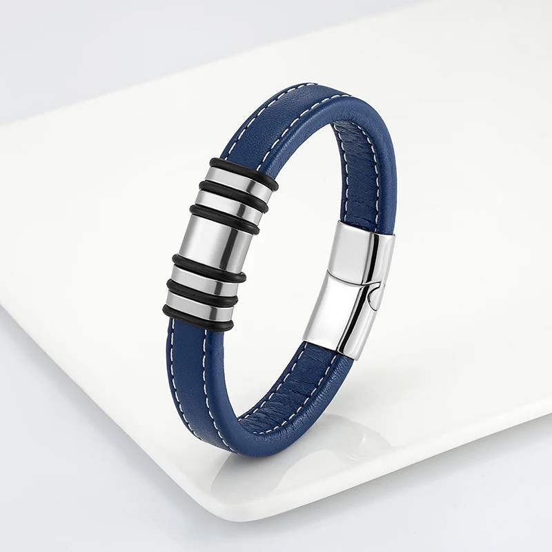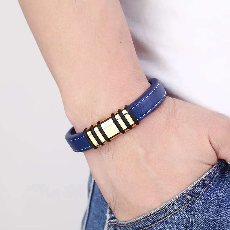 2021 новый модный простой Панк стиль 5 колец из нержавеющей стали Мужской классический браслет синий широкий кожаный браслет