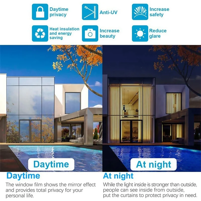 Защита конфиденциальности: односторонняя оконная пленка и зеркальный эффект, которые защищают вашу конфиденциальность в течение дня. Более легкая сторона не позволяет видеть менее яркую сторону. Вечером, если интерьер ярче, чем внешний, не забудьте закрыть занавеску ночью.