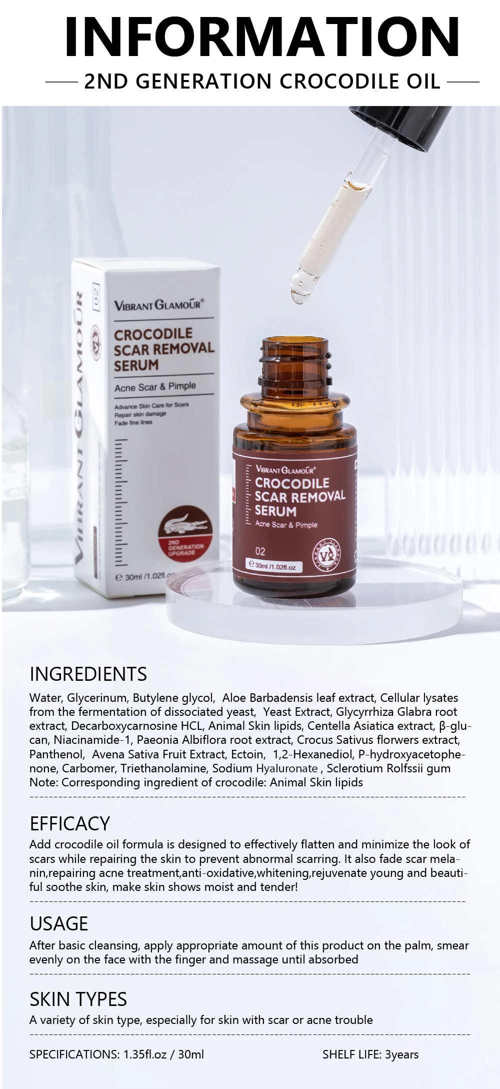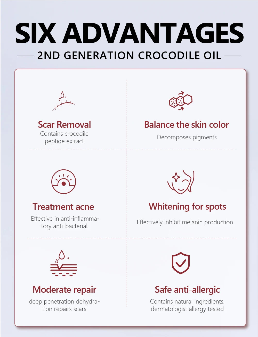 Эффективность: формула масла крокодила предназначена для эффективного сглаживания и минимизации внешнего вида шрамов при ремонте кожи, чтобы предотвратить аномальное рубцевание. Он также выцветает шрам мела-nin, восстанавливает лечение акне, антиоксидантный, отбеливает, омолаживает молодую и уютную кожу, делает кожу увлажненной и нежной!