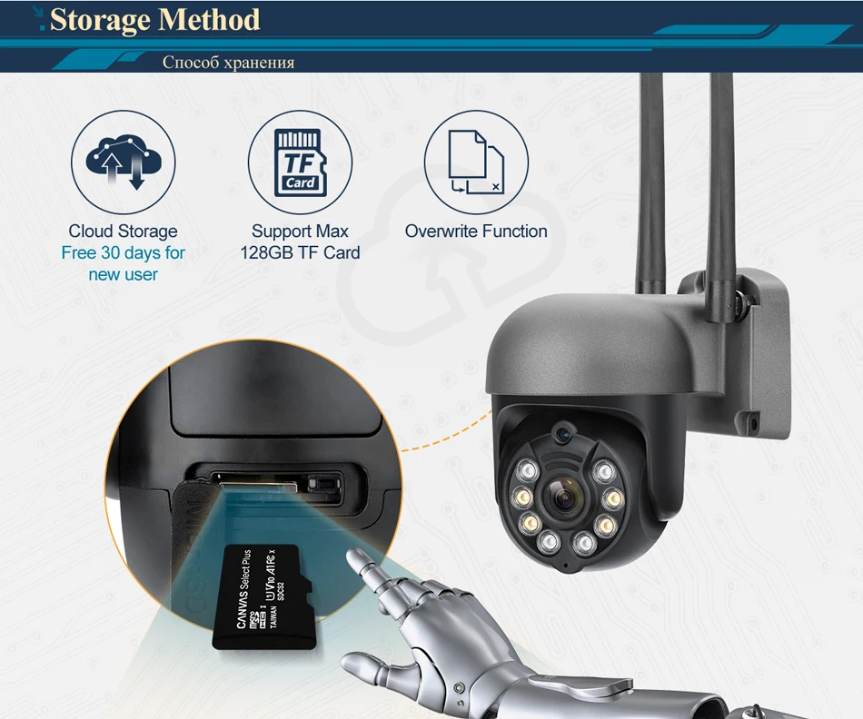 Поддержка до 128 ГБ TF карт памяти и облачного хранилища