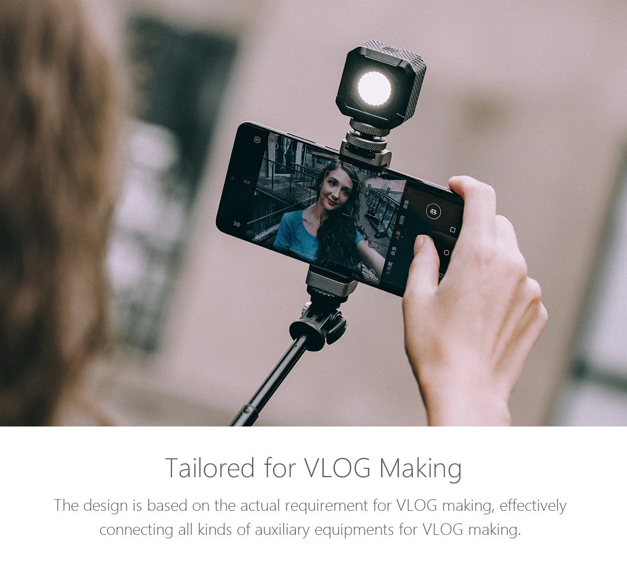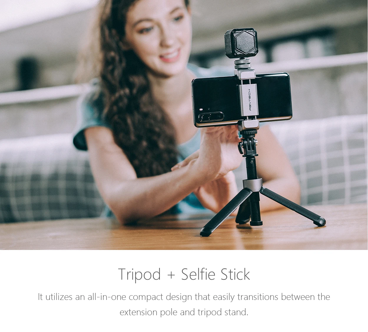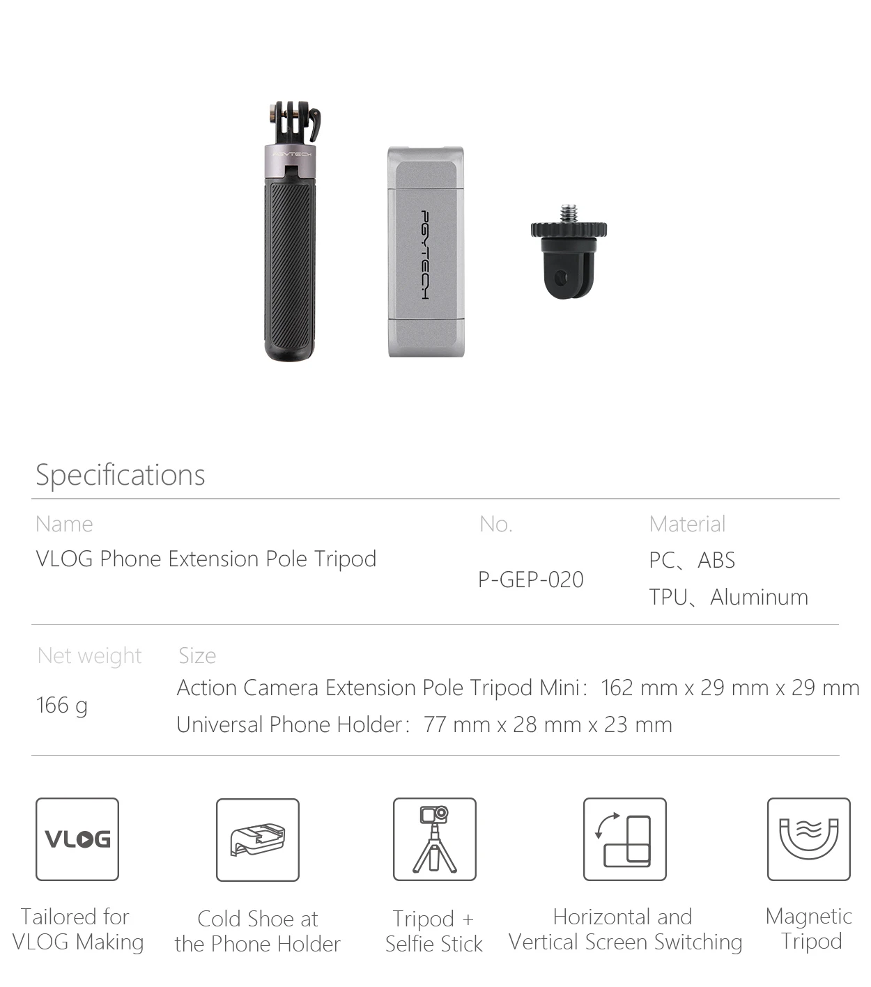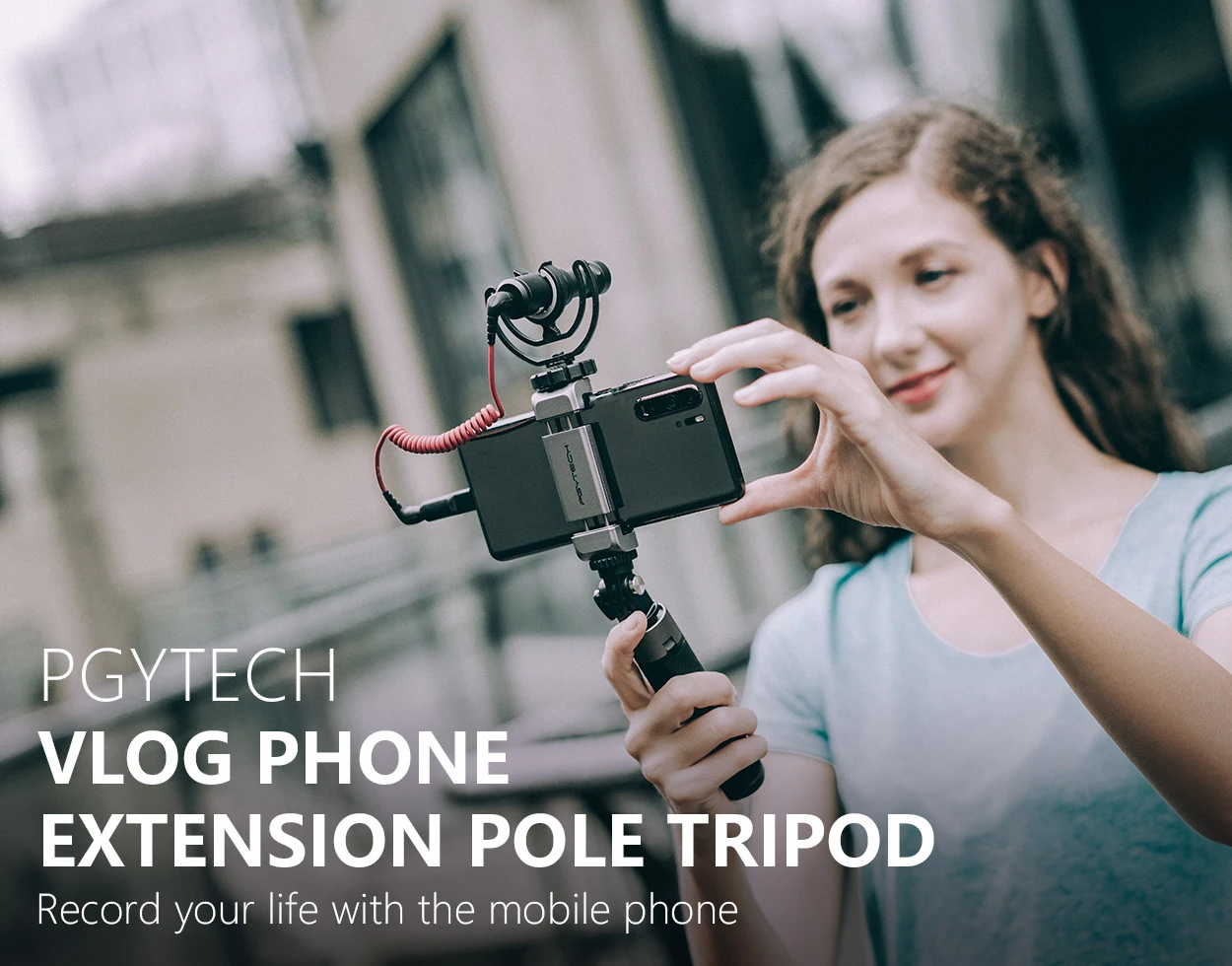 ●VLOG Phone Extension Pole Tripod is tailored for VLOG making and it provides professional support for VLOG making by various external connections. This product consists of two parts : PGYTECH Action Camera Extension Pole Tripod and PGYTECH Phone Holder.