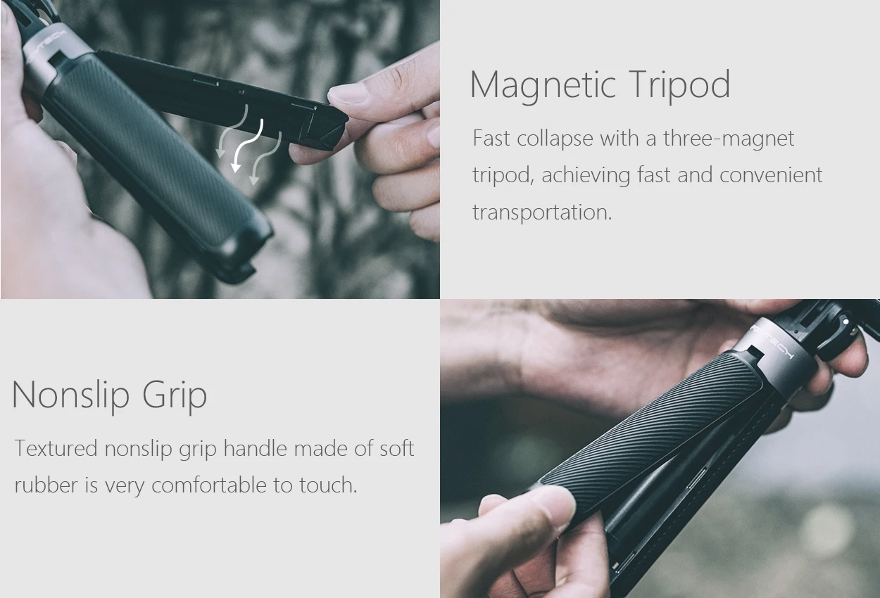 ●Textured nonslip grip handle made of soft rubber is very comfortable to touch. The universal interface at the top of the pole is compatible with a variety of equipment when it is detached with the phone holder.