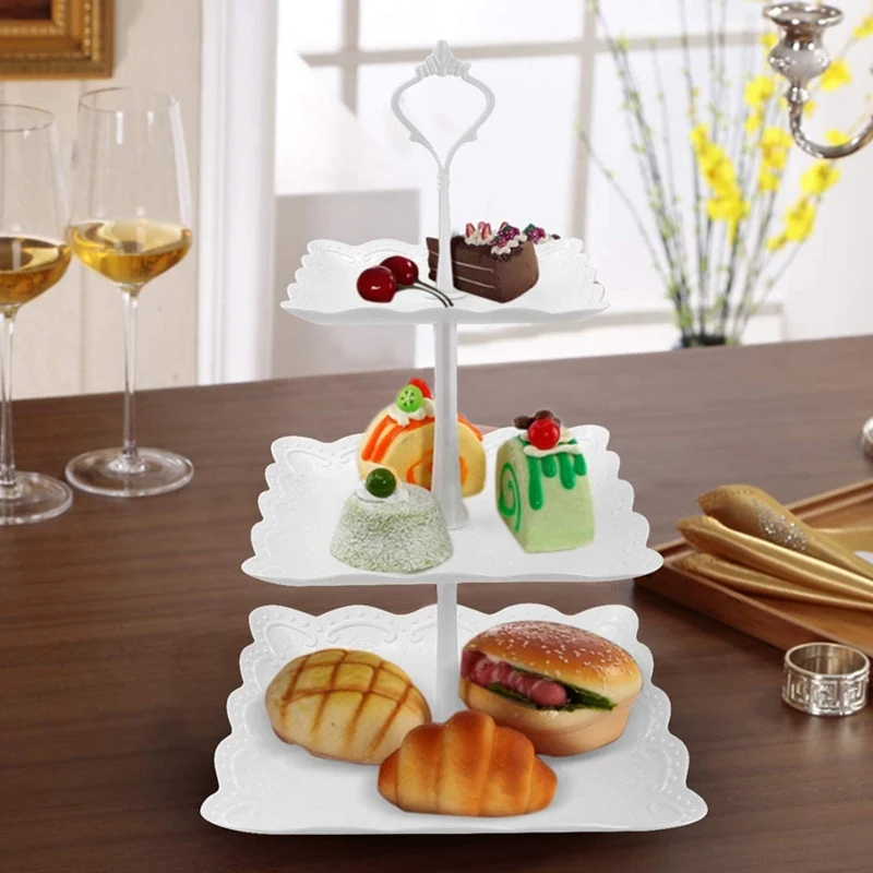 Три яруса Белый торт стенд, пластиковый квадратный торт стенд дисплей фрукты пластина, подставка для десерта на день рождения