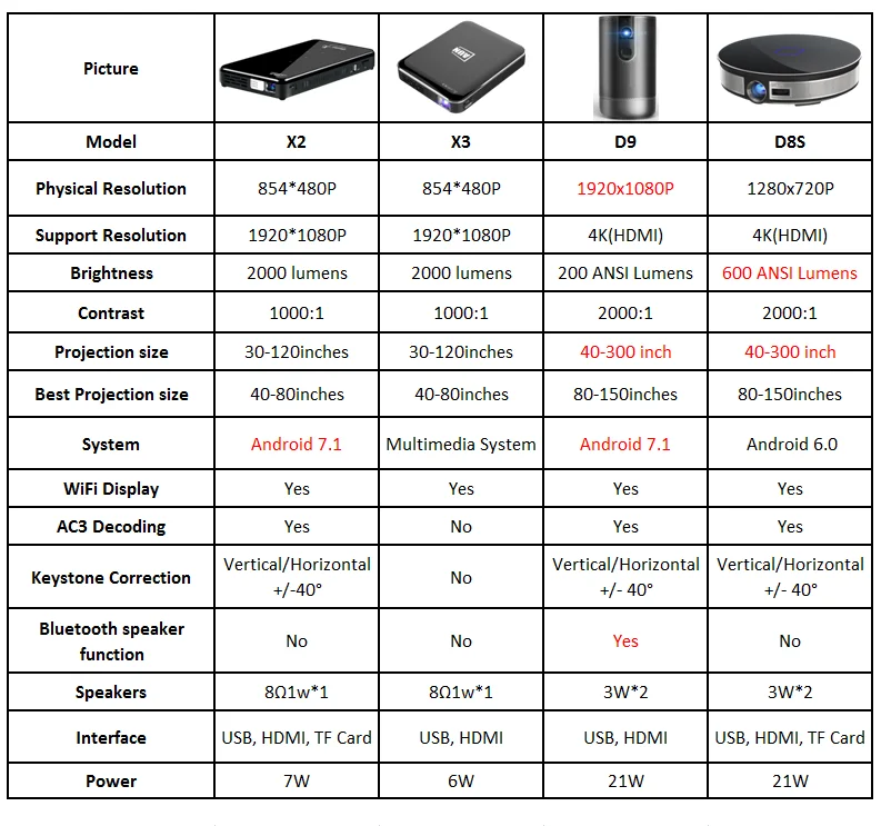 Пожалуйста, обратите внимание на точность параметров от других проекторов на рынке!