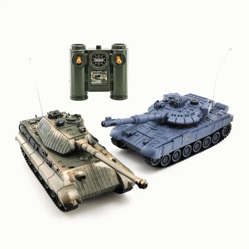 Радиоуправляемая танковая битва T90 и Royal Tiger-популярный набор в масштабе от 1 до 28 и панелях управления 2,4G. Модели танков большие, тяжелые и прочные. Танки максимально соответствуют оригиналам и хорошо детализированы. Бак производит звук снимка, красный светодиодный свет, символизирующий выстрел из пистолета, и происходит эффект отдачи, небольшой отвернутый бак. Танки могут двигаться во всех направлениях, вращаться вокруг своей оси, преодолевать небольшие препятствия и поднимать крутые подъемники до 45 градусов. Башня бака вращается на 300 градусов, чтобы повернуть башню на пульте дистанционного управления, есть две кнопки, поверните влево и вправо. Танк может снимать из пистолета или из пулемета, в то время как соответствующий звук и вспышка. Боевой танк начинается с тем фактом, что у каждого танка четыре жизни-четыре горящие светильник показатели красного цвета, при попадании враг из пистолета, бак теряется. После того, как первый из противников получит четыре удара из пистолета, раунд считается играемым, и победитель уверен.