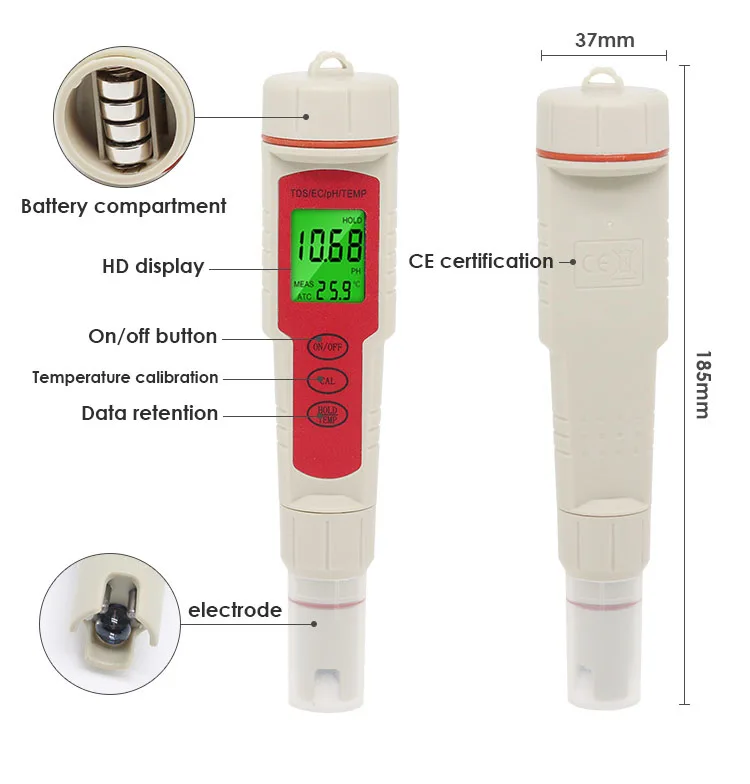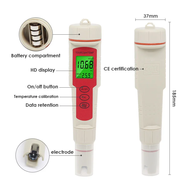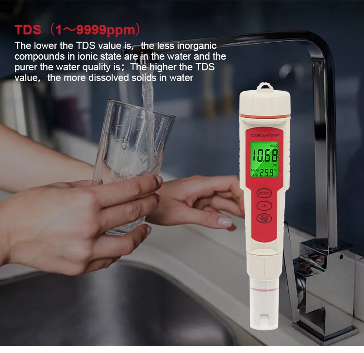 4-в-1 качества воды Тесты-прибор для измерения уровня pH имеет три-в-одном функции, который может измерять PH, TDS, EC и температуры с высокой точностью в одно и то же время. Всестороннее измерение качества воды для обеспечения здорового качества воды.