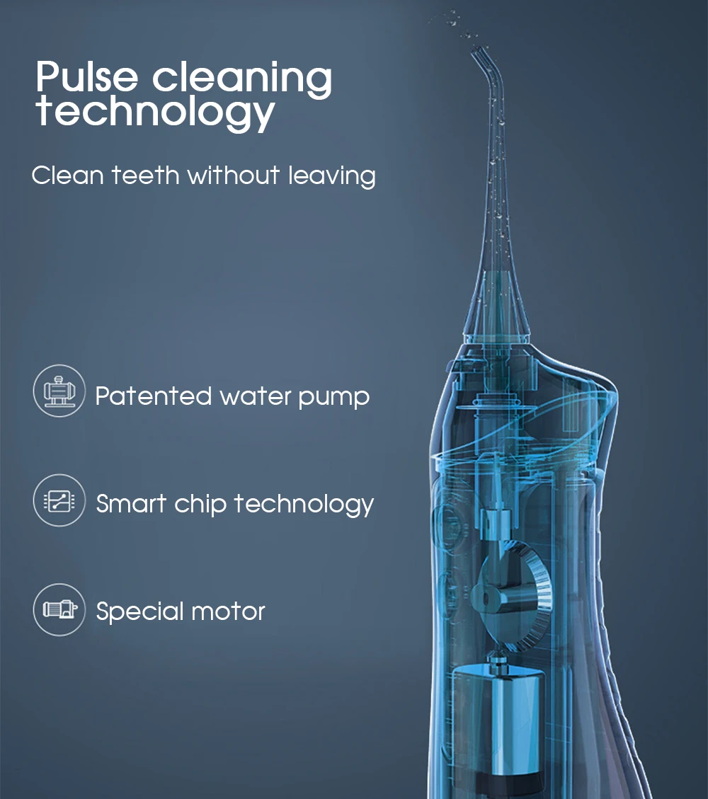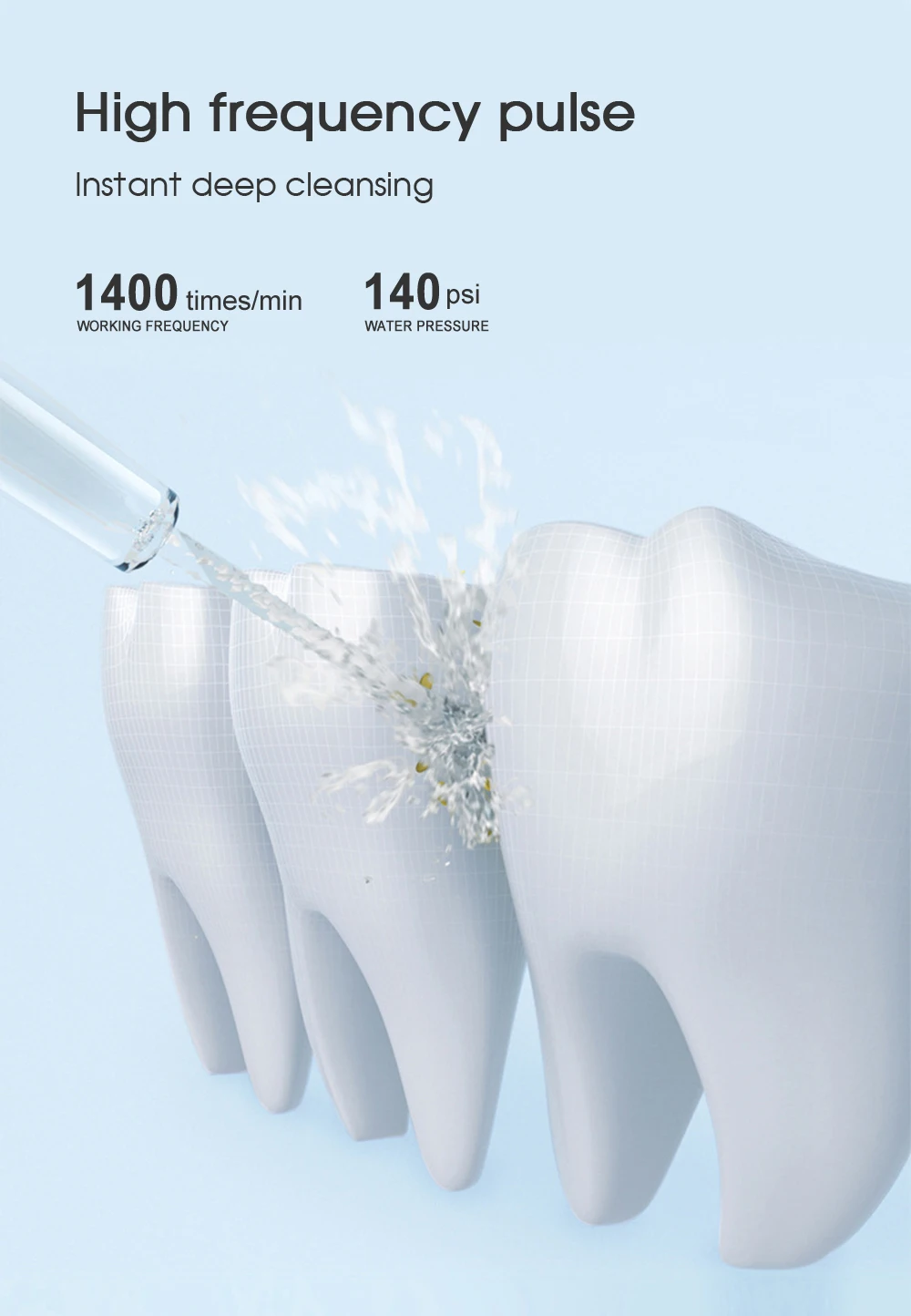 ● Оснащен новым типом интеллектуального двигателя с постоянным магнитом, давление воды достигает 14 OPSI, который может генерировать 1400 раз/мин Высокочастотный импульсный водяной столб, который проникает в зазор между зубами и слепой областью полости рта, быстро смывает остатки пищи и ухаживает за деснами.