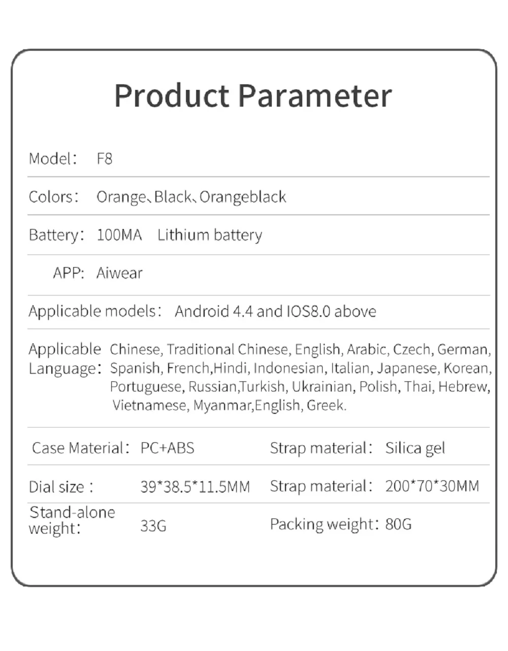 2.Watch Language support:Chinese English Korean Japanese German Spanish French Italian Portuguese Arabic Hindi Polish Russian Dutch Turkish Indonesian Czech.