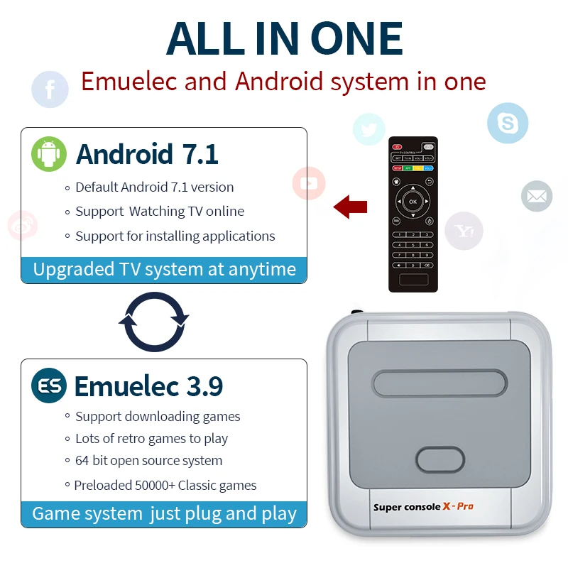 Игры/ТВ все в одном (супер консоль x pro) Супер консоль X PRO с двойной системой (Emuelec 3,9 и Android). Super Console X-это игровая консоль, не поддерживающая функцию TV Box. Обновите S905X чип, основная частота может достигать до 2,0 ГГц, который может лучше работать крупномасштабных игр без заиканий.