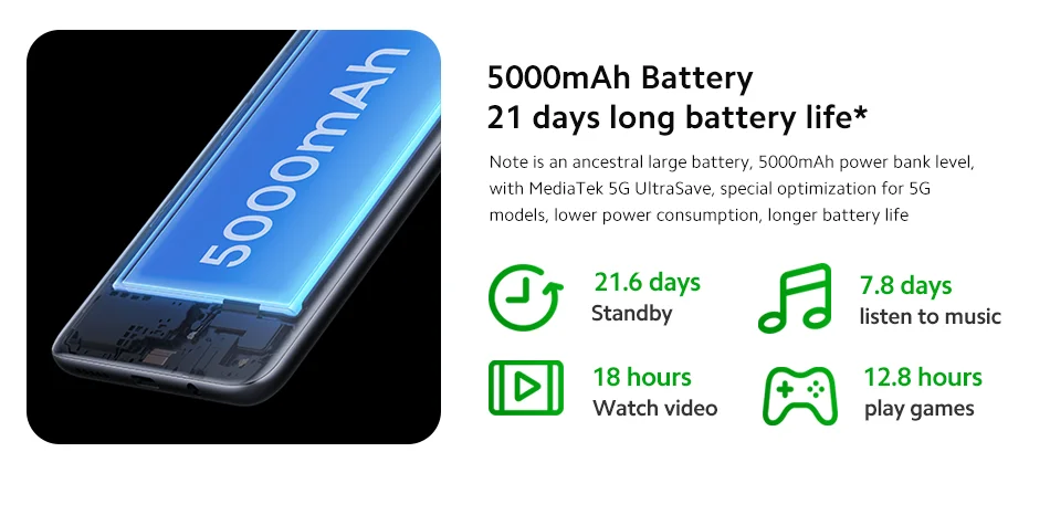Аккумулятор 5000 мАч21 день долгий срок службы батареиОбратите внимание, что это большая батарея предков, 5000 мА · ч, с MediaTek 5G UltraSave, специальная оптимизация для моделей 5G, более низкое энергопотребление, более длительный срок службы батареи