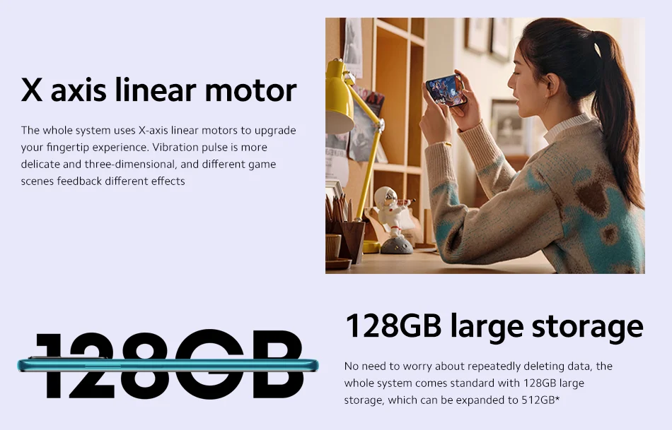 Моторный вкладыш оси XВся система использует линейные моторы оси X, чтобы обновить ваш опыт пальцев. Вибрационный Пульс более деликатный и трехмерный, и различные игровые сцены обратной связи различные эффекты.Большая память 128 ГБНе нужно беспокоиться о повторном удалении данных, вся система поставляется со стандартным объемом памяти 128 ГБ, который может быть расширен до 512 Гб *