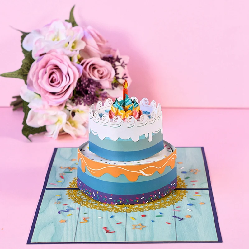 3D-карта на день рождения с синим двухслойным дизайном торта, день рождения карты с конвертом для семьи, друзей, детей, женщин