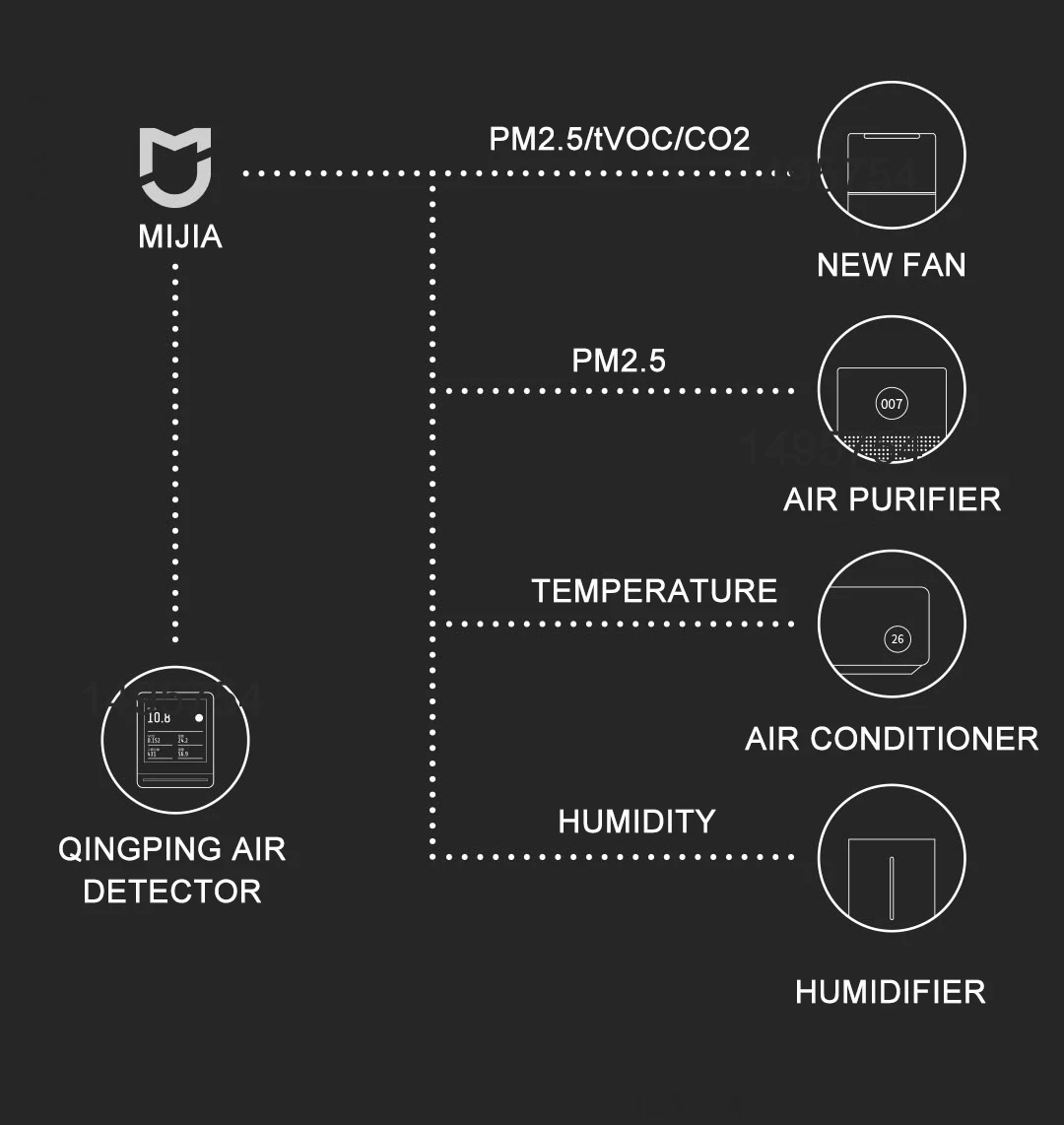 Qingping air detector is the best partner of Xiaomi Mijia air improvement equipment. Through the Mijia app, you can set the Qingping air detector to link a variety of fresh air fans, air purifiers, air conditioners, electric fans, and humidifiers. Once the temperature or humidity, PM2.5, tVOC, or carbon dioxide reaches the set value, it will automatically turn on or Turn off related equipment.