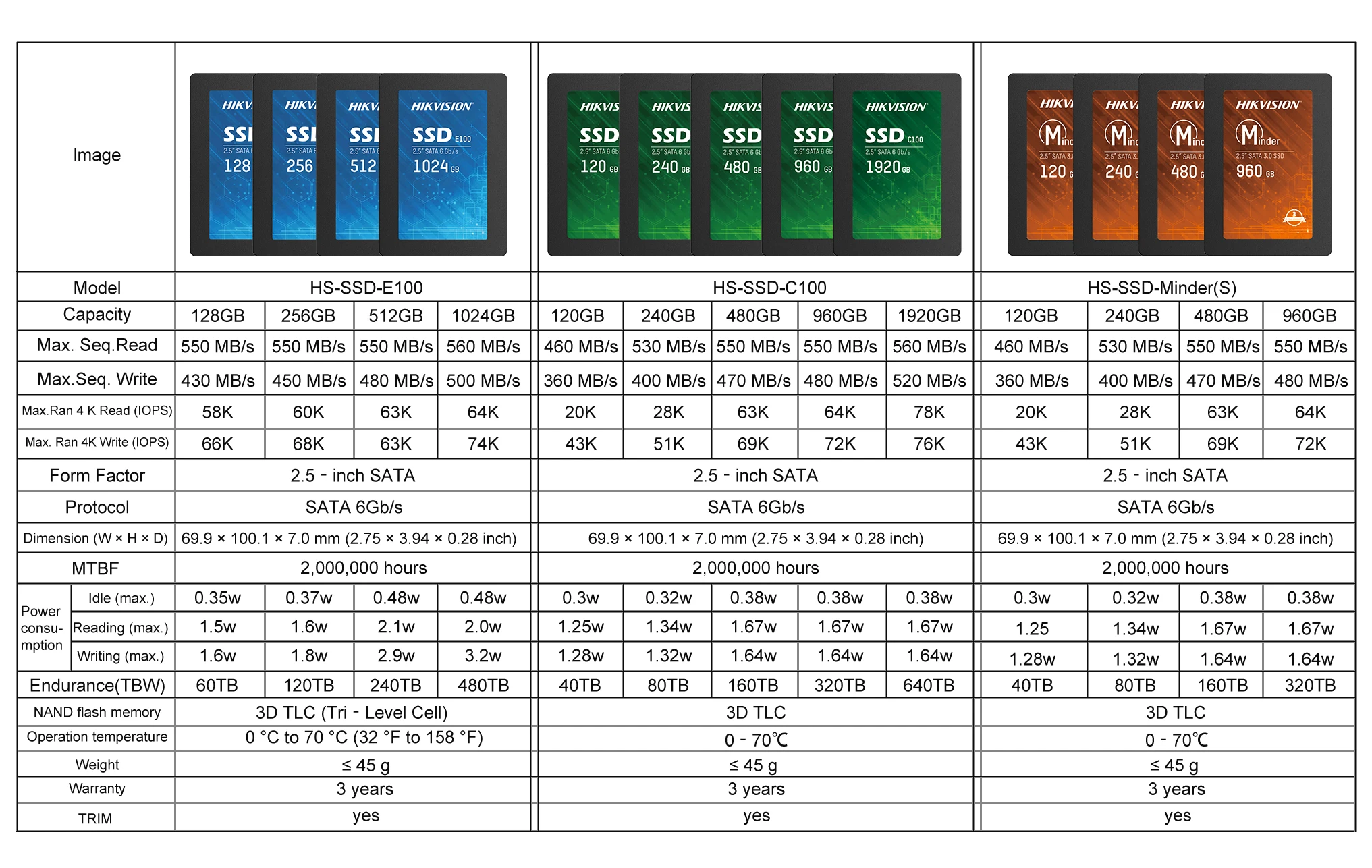 HikvisionMinder (ы) внутренний SSD накопитель однотонные StateDiskStorage, флэш-память, до 560 МБ/с., 3D NAND2.5inchSATA 3,0, 120 ГБ/240 ГБ/480 ГБ/960 ГБТвердотельный накопитель серии TheHikvision Minder(S) разработан с многолетним опытом и опытом в области технологии хранения и управления флеш-памятью.