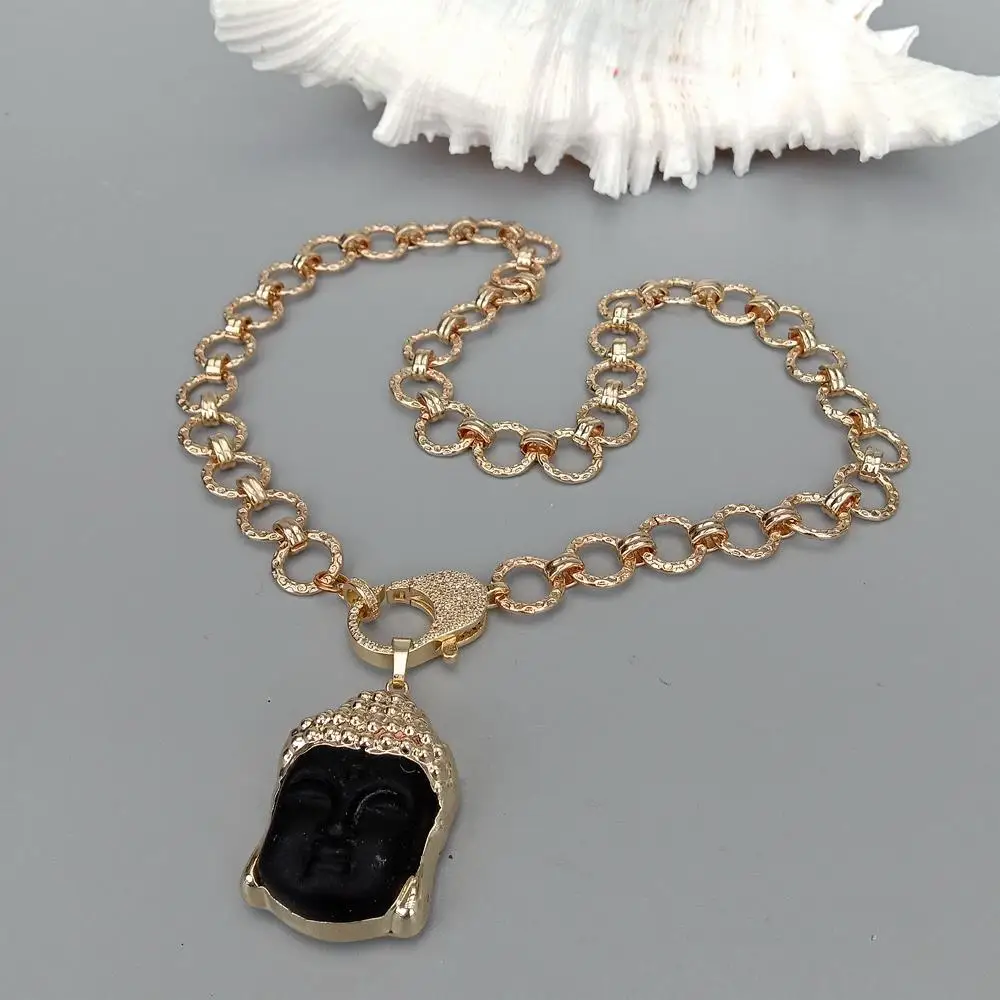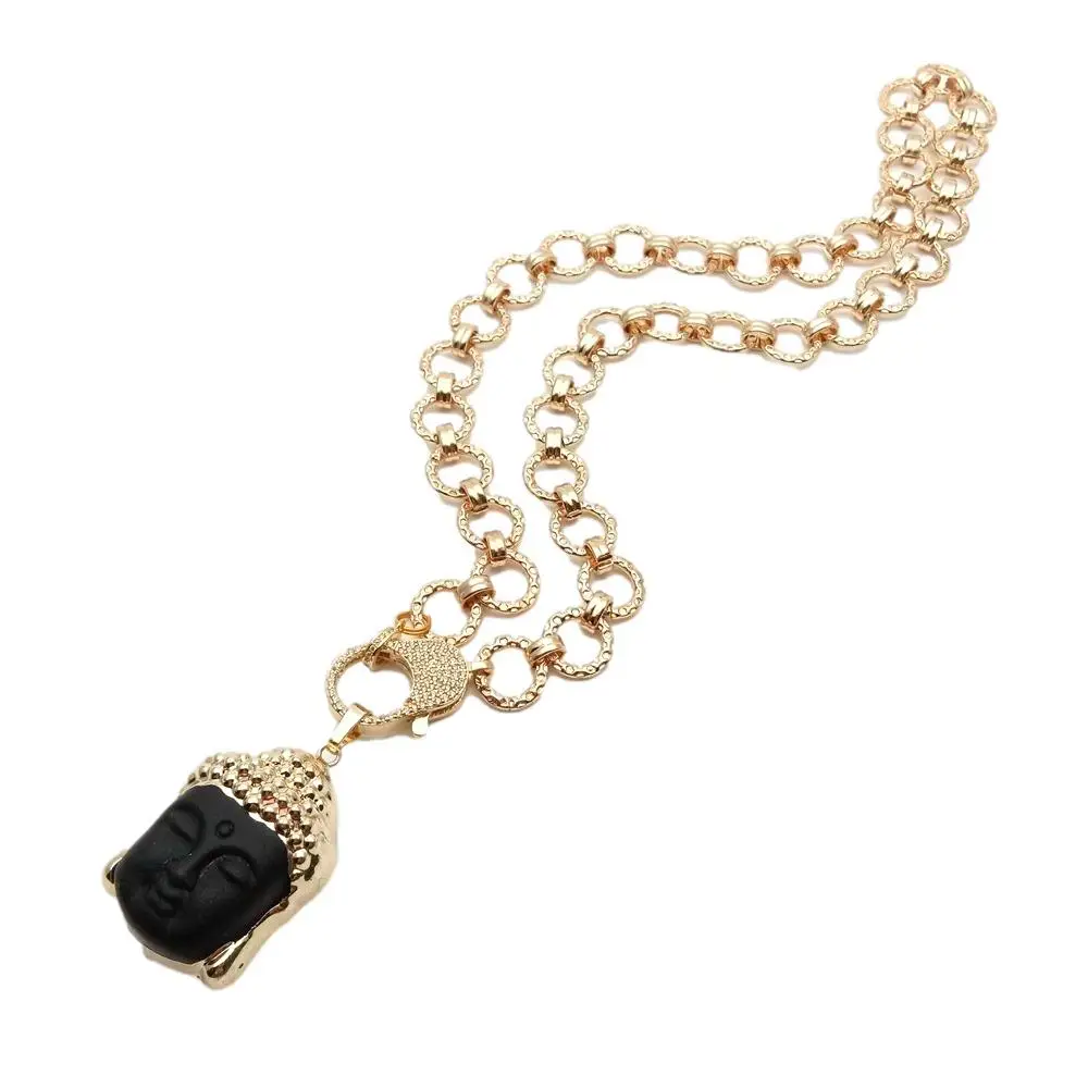Gems Info: black onyx carved Buddha pendant, gold plated chain.