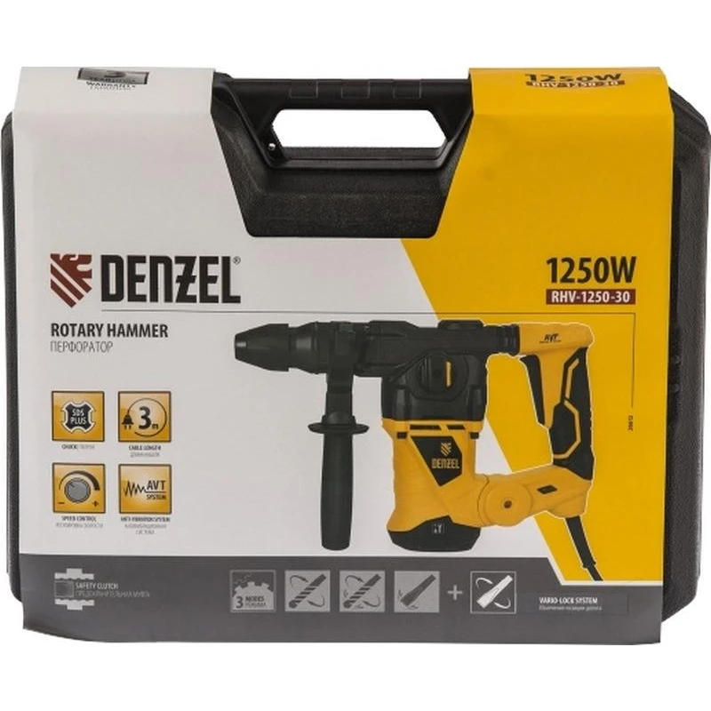 перфоратор DENZEL RHV-1250-30 (26612) • электрический • ударный • 1250 Вт • SDS+ • от 0 • до 850 об/мин • от 0 • до 4500 уд/мин • 5 Дж • желтый, черный • 1 шт. • коммерческая упаковка • кейс