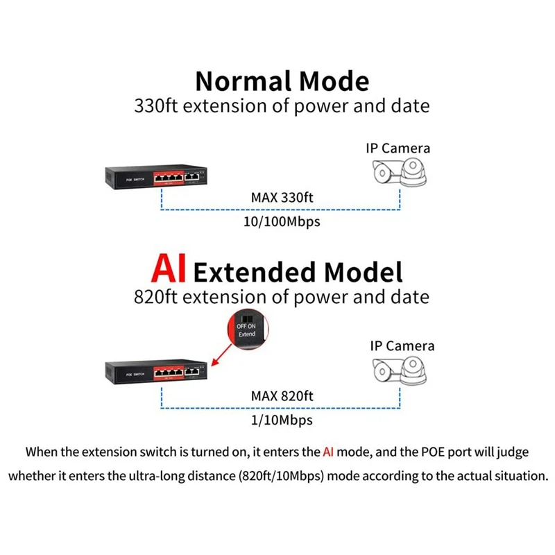 [AI 250 метров функция расширения] Включите удлинитель с переключателем, он входит в режим AI (порт POE будет определять, входит ли он на ультра-большое расстояние (820ft/10 Мбит/с) режим в соответствии с реальной ситуацией). Расширенная функция расширения максимальной мощности и расстояния передачи данных от 100 метров (330ft) До 250 метров (820 футов). Что легко расширить сеть через ethernet кабель где-то без источника питания, но нужно исправить устройства, такие как ip-камеры.