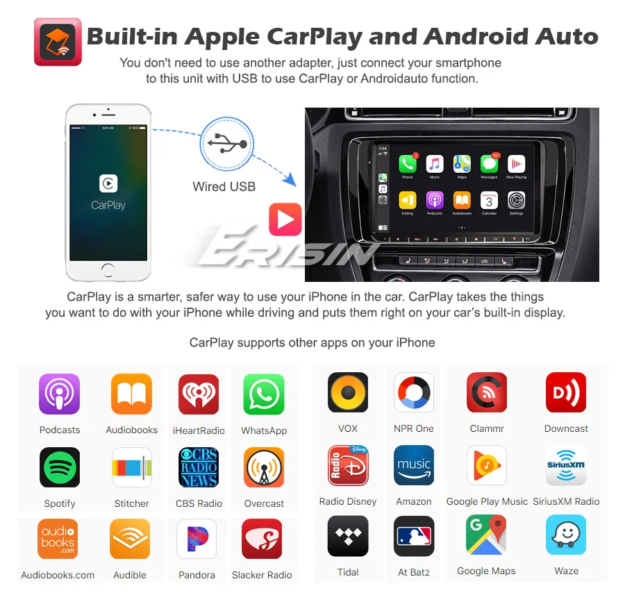 -Встроенный автоматический модуль Apple CarPlay и Android. Вам не нужно использовать другой адаптер, просто подключите