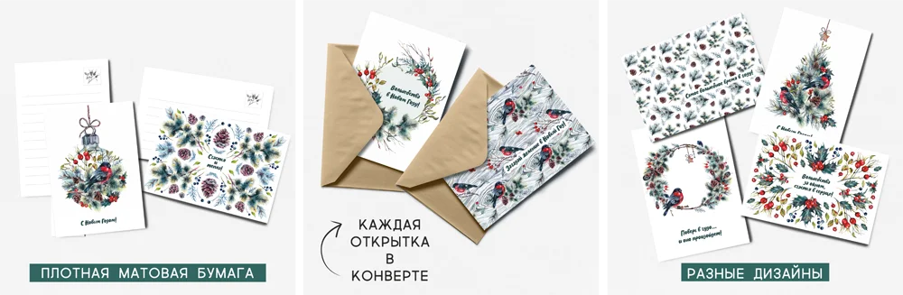 Набор из 8 открыток с яркими новогодними иллюстрациями, снегиря, елки в классических цветах!