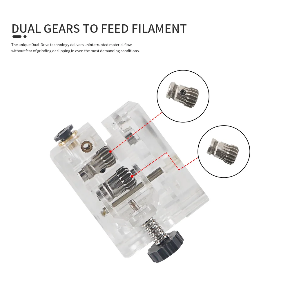 2. Экструдер предназначен для 1,75 мм, И Крепежное пружинное устройство позволяет пользователю отрегулировать подачу двойного привода, применяемого к давлению расходных материалов. Это позволяет пользователю регулировать герметичность в соответствии с характеристиками расходных материалов. Уникальная двухканальная передача минимизирует скольжение и увеличивает мощность подачи. Устройство редуктора может также выдавать больше крутящего момента, уменьшить нагрузку двигателя, продлить срок службы Мотор.