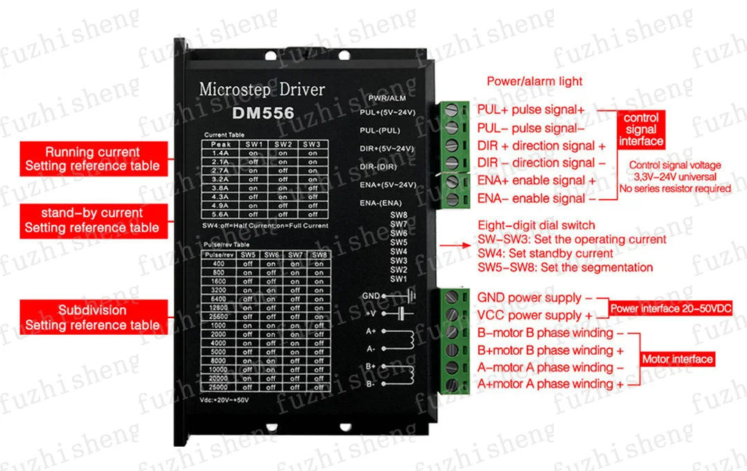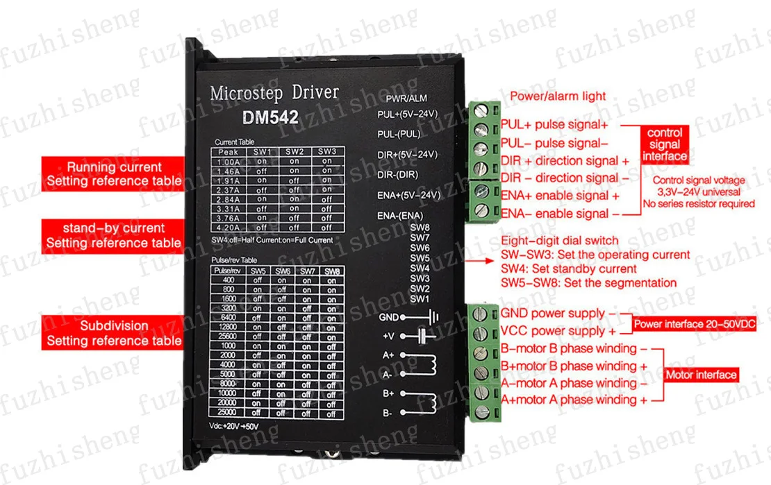 DM542 или DM556 является универсальным полностью цифровым шаговым диском на основе DSP с усовершенствованным алгоритмом управления. DM542 или DM556-это новое поколение управления цифровым шаговым двигателем. Он приносит уникальный уровень гладкости системы, обеспечивая оптимальный крутящий момент и устраняет нестабильность среднего диапазона. Технология автоматической настройки двигателя и параметров обеспечивает оптимальные отклики с различными двигателями и простоту в использовании. Приводные двигатели могут работать с гораздо меньшим шумом, более низким нагревом, плавным движением, чем большинство приводов на рынках. Его уникальные особенности делают DM542 или DM556 идеальным решением для приложений, которые требуют низкой скорости гладкости.