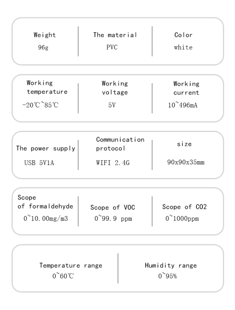 Диапазон обнаружения smart air box: формальдегид, газ VOC, CO2, температура, влажность