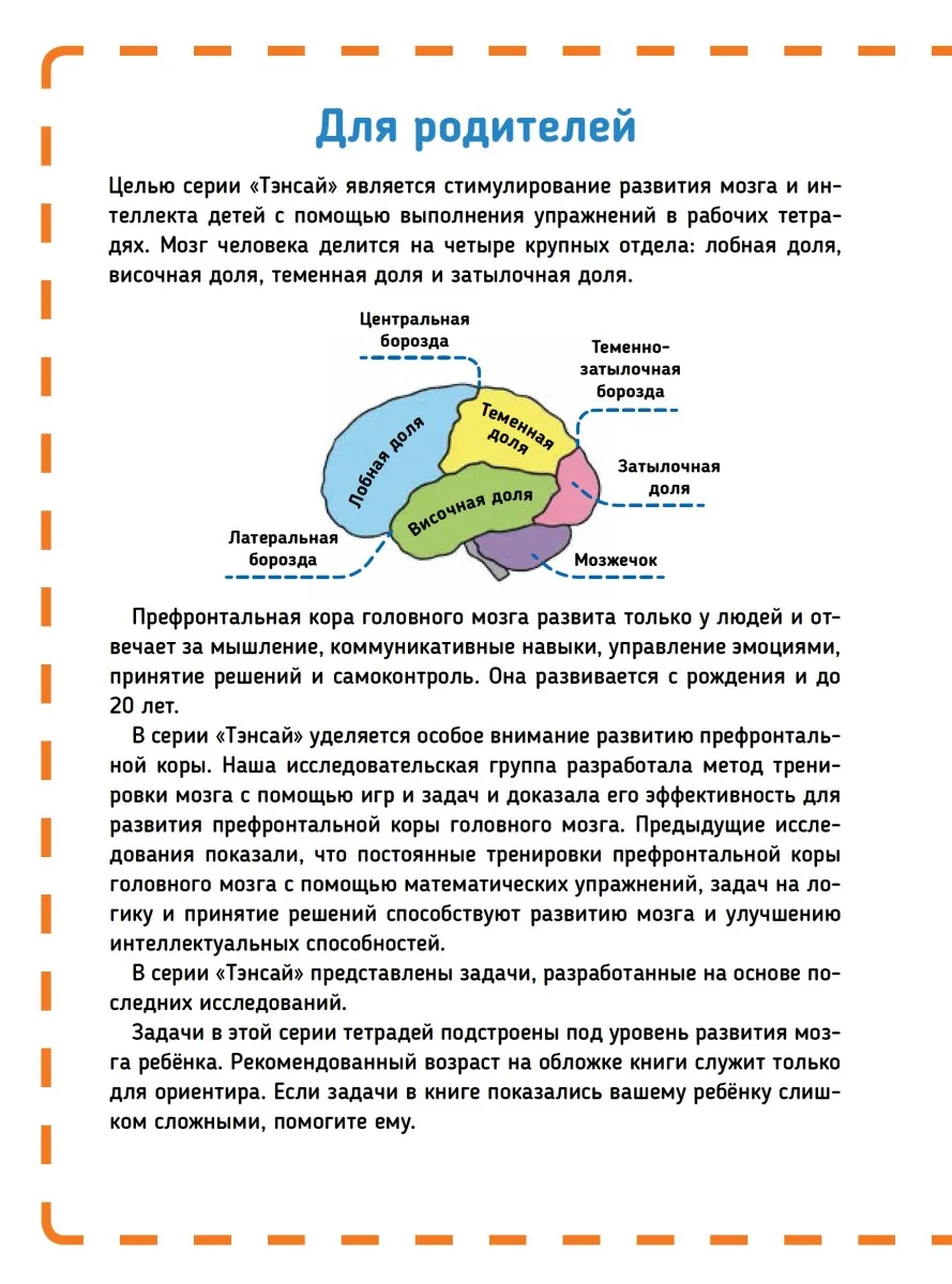 ТЭНСАЙ переводится с японского как «одарённый, умный, гений» и развивает как базовые способности ребенка – мышление, логику, память, воображение, внимание и наблюдательность, – так и навыки, важные в определённом возрастном периоде. Простые задания шаг за шагом простимулируют работу правого и левого полушарий мозга, повысят интеллект и умственные способности.