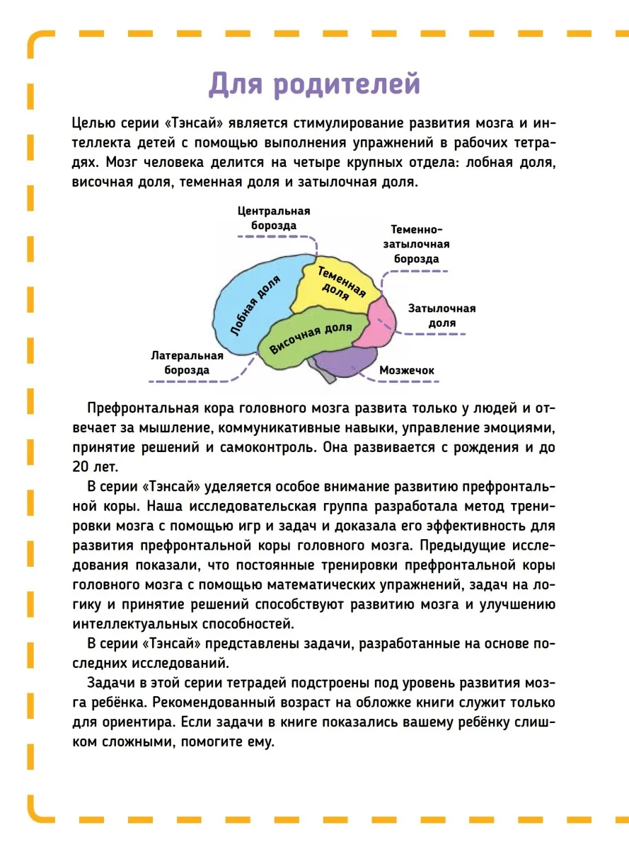 ТЭНСАЙ переводится с японского как «одарённый, умный, гений» и развивает как базовые способности ребёнка – мышление, логику, память, воображение, внимание и наблюдательность, – так и навыки, важные в определённом возрастном периоде. Простые задания шаг за шагом простимулируют работу правого и левого полушарий мозга, повысят интеллект и умственные способности.
