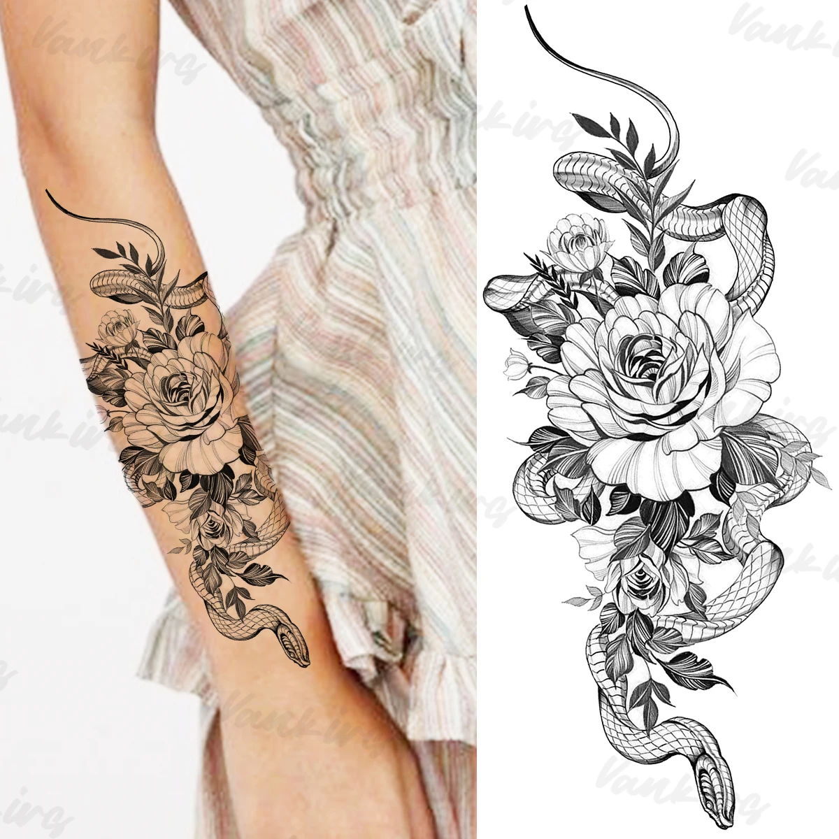 Черный цветок временные татуировки для женщин девочек реалистичные змеиная Флора водонепроницаемые поддельные наклейки-тату на руку тела татуировки сексуальные
