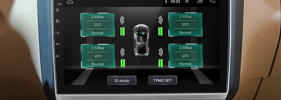 Отображает 4 давления и температуры в режиме реального времени. Как только давление или температура в шинах будут необычными, сразу же будет сигнал тревоги.