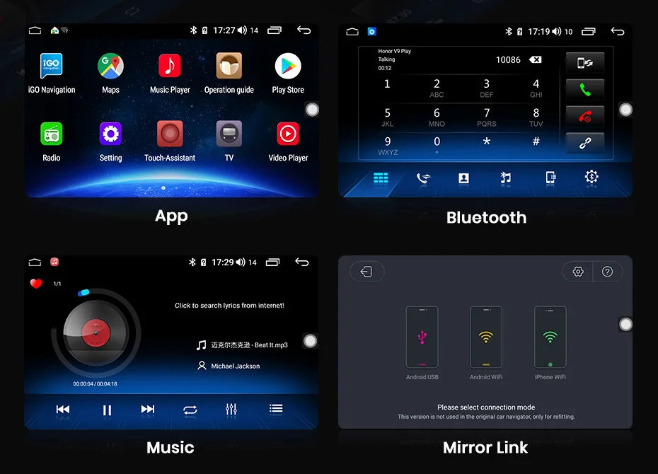 Устройство оснащено Навигатором, воспроизведением музыки, функцией парковки и т. д. для подключения к Интернету версии Wi-Fi должны служить вашим смартфоном в качестве точки доступа. Для владельцев автомобилей, которые часто используют Интернет во время путешествия, мы рекомендуем купить версии 4G.