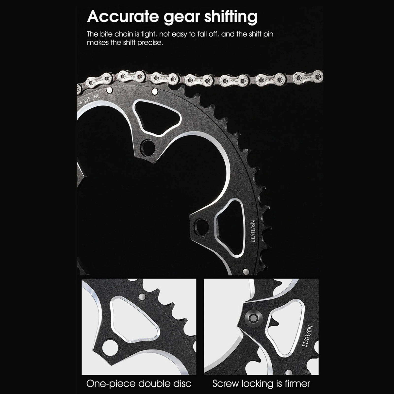 Специальная конструкция зуба: обеспечивает мощную функцию стабилизации цепи для обеспечения гладкой и стабильной верхней и нижней цепей во время высокоскоростной езды