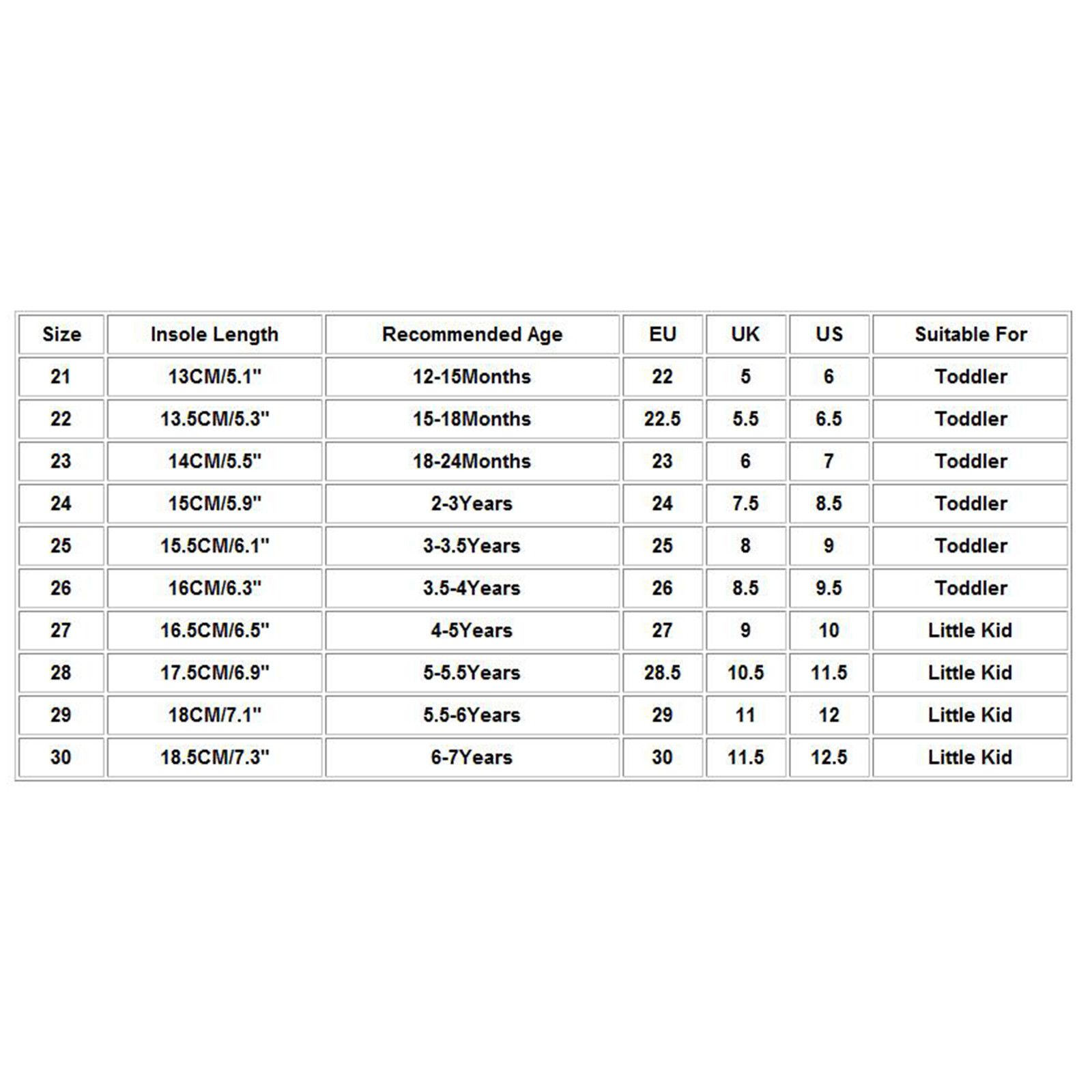 Размеры Длина стельки Рекомендуемый возраст ЕС Великобритания США Подходит для 21 13 см/5,1" 12-15Months 22 5 6 Для малышей 22 13,5 см/5,3" 15-18Months 22,5 5,5 6,5 Для малышей 23 14 см/5,5" 18-24Months 23 6 7 Для малышей 24 15 см/5,9" 2-3Years 24 7,5 8,5 Для малышей 25 15,5 см/6,1" 3-3.5Years 25 8 9 Для малышей 26 16 см/6,3" 3,5-4 лет 26 8,5 9,5 Для малышей 27 16,5 см/6,5" 4-5Years 27 9 10 Маленький ребенок 28 17,5 см/6,9" 5-5.5Years 28,5 10,5 11,5 Маленький ребенок 29 18 см/7,1" 5,5-6 лет 29 11 12 Маленький ребенок 30 18,5 см/7,3" 6-7Years 30 11,5 12,5 Маленький ребенок
