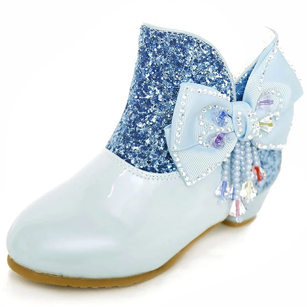 Зимние Детские ботильоны принцессы с украшением в виде кристаллов; Обувь для выступлений для маленьких девочек; Детская обувь на высоком каблуке с синим бантом и блестками; 2021CNY 396,5/Пара/Лот 1