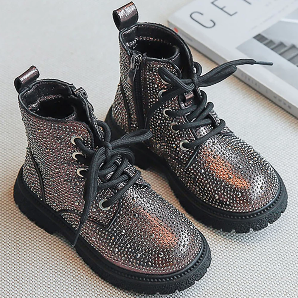 Детские ботильоны Martin для девочек; Модная обувь на плоской подошве для мальчиков; Детские ботинки на платформе с яркими кристаллами для маленьких студентов; Сезон осеньCNY 342,9/Пара/Лот 1