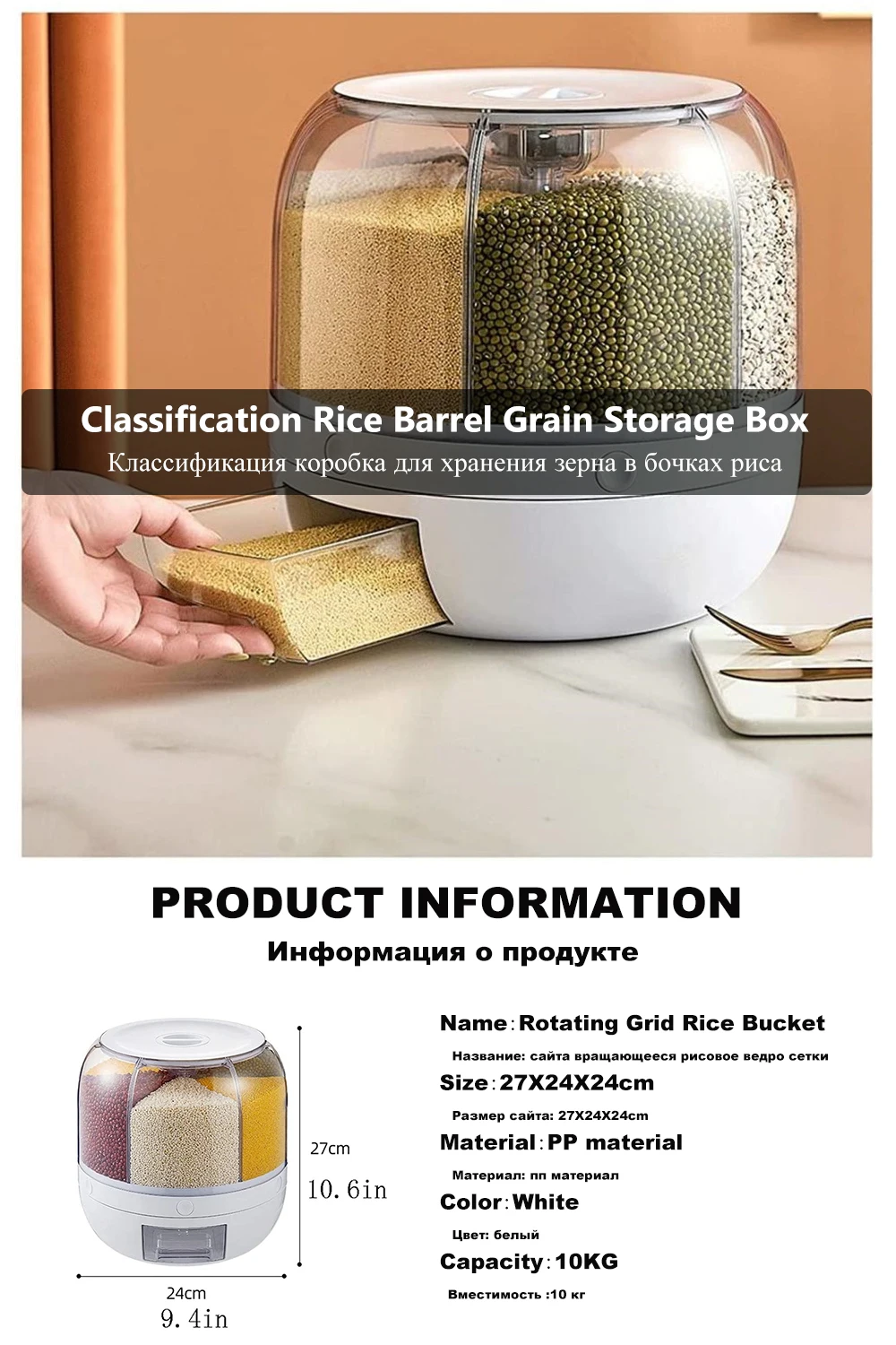 【Материал и размер 】изготовлен из полипропиленового материала, безопасный и здоровый, долговечный и долгосрочный. Размер ведра для риса-27X24X2 4 см/