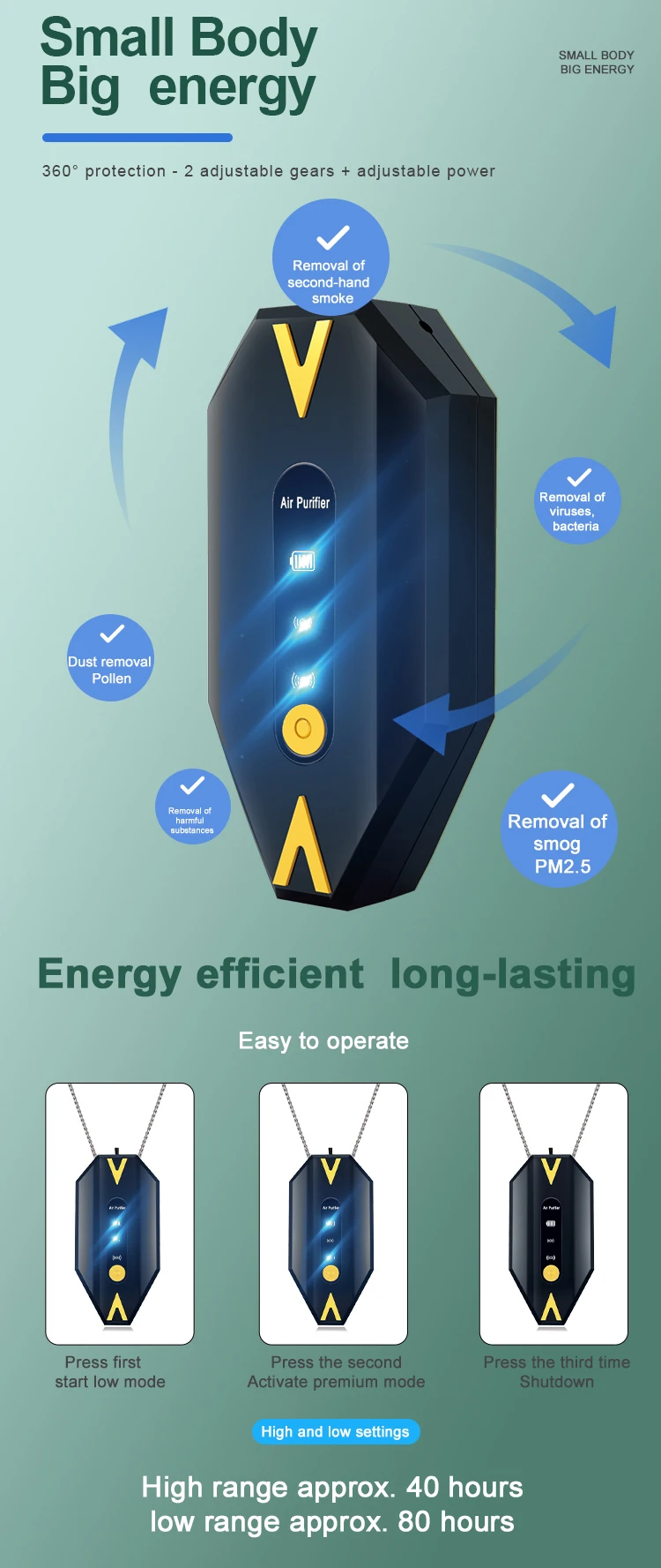Портативный Регулируемый небольшой формы, большой очистки износа мини очиститель воздуха с вами носить везде подходит для различных мест в различных местах, путешествия, вечерние, офис отрицательных ионов эмиссионные головки углеродного волокна кисти чистый воздух. Принцип работы: Выпустите отрицательные ионы в воздух с помощью встроенной системы кистей из углеродного волокна. Высвобождаемые отрицательные ионы крепятся к молекуле воздуха и неочищенным частицам в воздухе, что делает их отрицательными. Переноска отрицательно заряженных частиц эксклюзивный, вдали от вашего дыхательного пространства, и притягивается близко к поверхности положительного заряда, образуя большие частицы, чтобы осесть на земле, тем самым Избегайте доступа к вашей дыхательной системе.