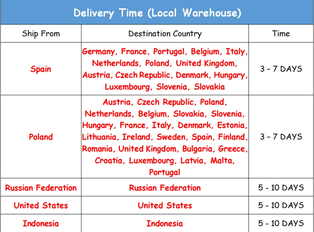У нас есть местный склад в России, США, Испании, Польше и Индонезии. Если вы хотите быструю доставку, пожалуйста, выберите «Доставка из России, США, Испании и PL или в», вы будете наслаждаться местной службой, поддержка 15 дней возврата на местный склад без причины, бесплатная пошлина НДС для покупателей.