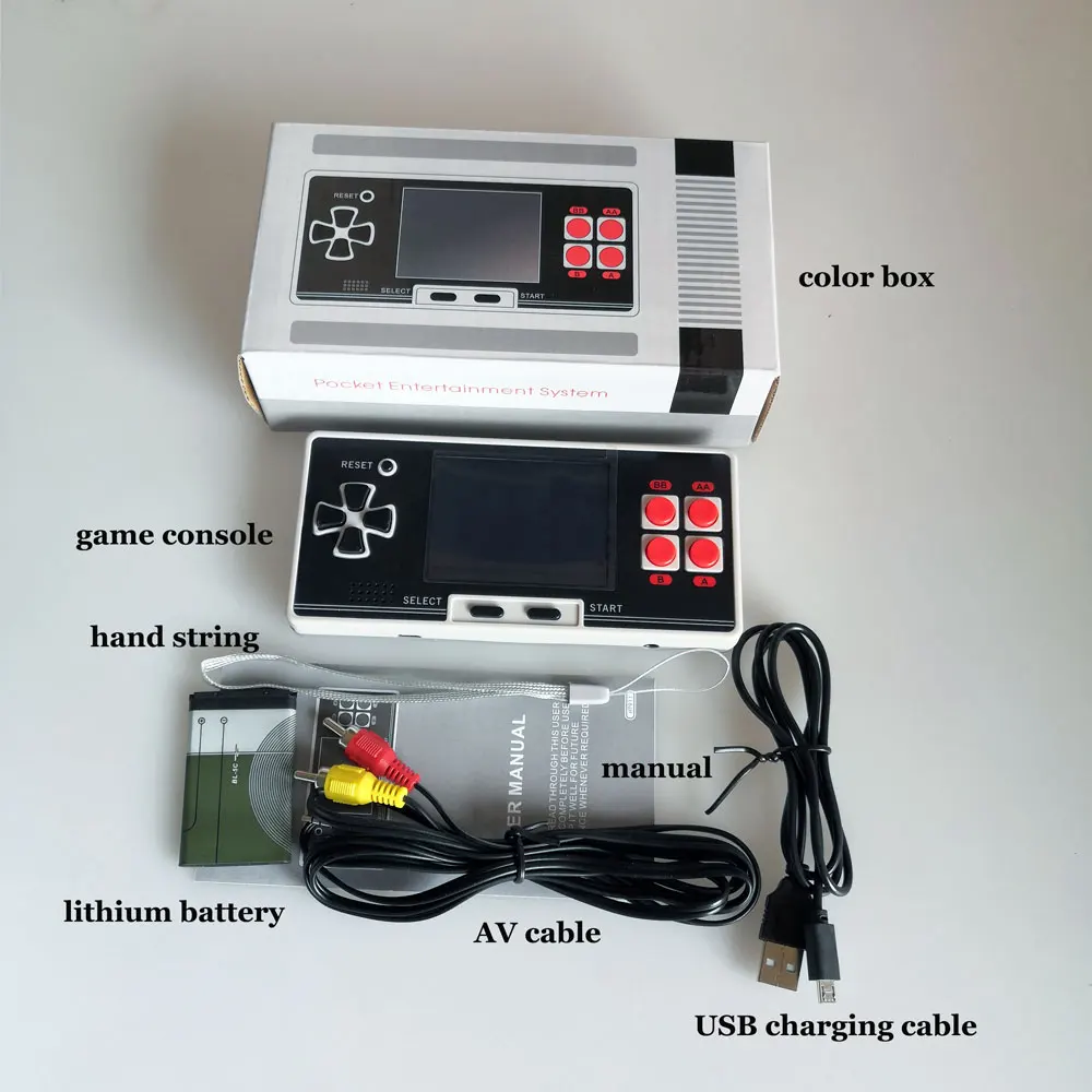Портативная игровая консоль-1 шт., литиевая батарея-1 шт., av-кабель-1 шт., зарядный usb-кабель-1 шт., руководство-1 шт., Ручная Веревка-1 шт.