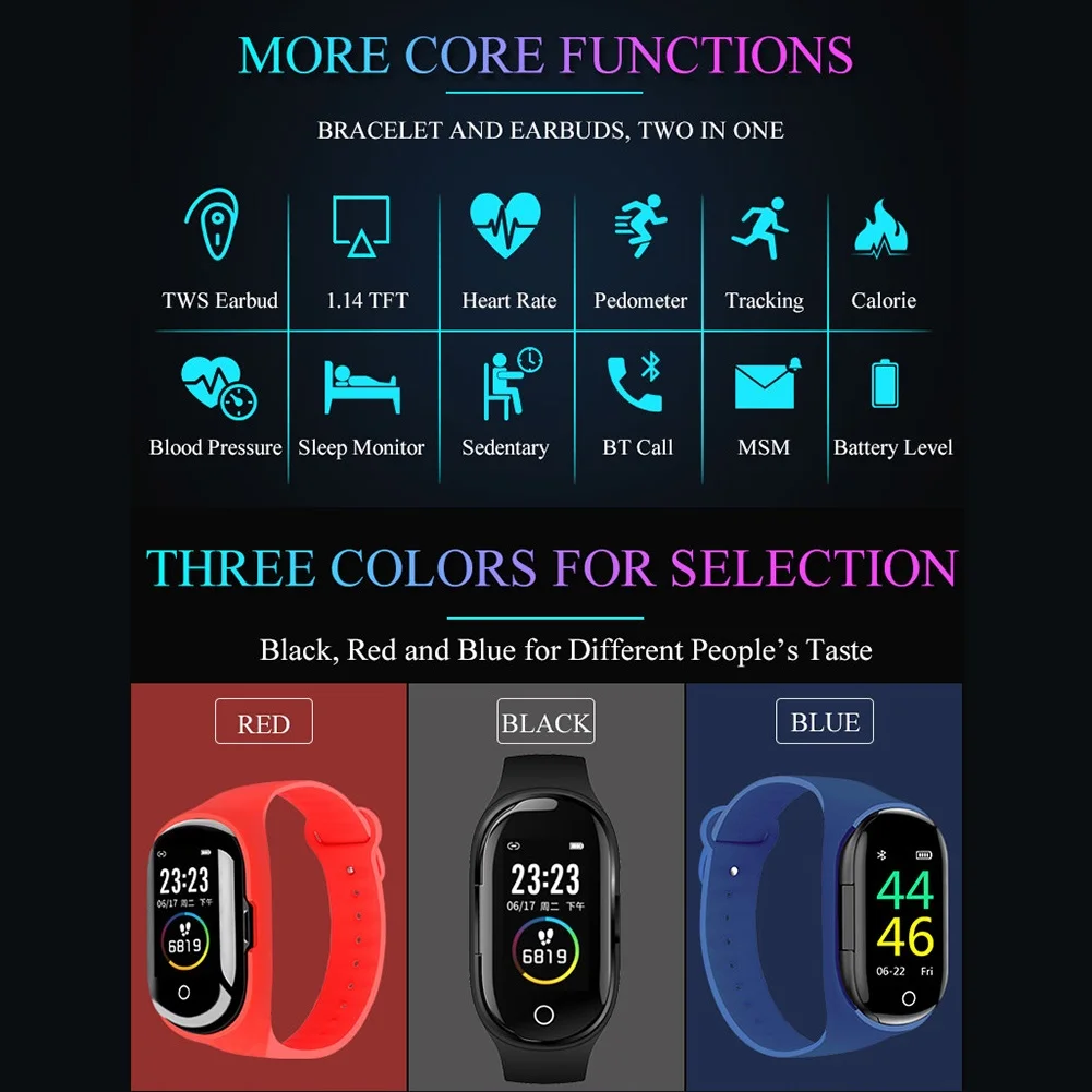 M1PRO умный браслет Bluetooth наушники Водонепроницаемый 2-в-1 UI Экран монитор сердечного ритма во время сна фитнес Смарт сенсорный экран Смарт-часы <;br/> Технические характеристики: :<; br/> Эти bluetooth-наушники Поддержка ответить или отклонить вызов.<;br/> сочетание смарт-браслета и bluetooth-наушников, более удобное для вас.<;br/> поддерживает кровяное давление и усилитель; Heartramonitoringcare для здоровья вашего тела непрерывно.<;br/> Поддержка напоминания о звонках и сообщениях, Таким образом, вы не пропустите ни одну важную информацию, даже если телефон не находится в руке.<;br/> Название изделия: умный Браслет <;br/> Материал: ABS<;br/>TWS эффективный диапазон: до 40 метров в открытом поле <;br/> Языки применения: английский, китайский и другие языки <;br/> чип наушников: для Realtek (RTL8763BFR 5,0)<;br/> Совместимая система: для Android, для iOS<;br/> флэш-память: 1 м байт <;br/> Тип экрана: 1,14 дюйма TFT<;br/> Разрешение экрана: 135*240<;br/> Режим работы: одно касание <;br/> чип смарт-браслета: MCUBE 4,2 <;br/> Емкость аккумулятора: 120 мАч для смарт-браслета, 28 мАч для одиночных наушников (в комплекте)<;br/> Тип зарядки: USB магнитно-контактный <;br/> Время зарядки: около 1,5 часов <;br/> Время использования: 7 дней <;br/> Время работы в режиме ожидания: 15 дней <;br/> наушники музыка и amp;CallPowerConsumption10mA<;br/> Водонепроницаемость: Водонепроницаемость в повседневной жизни (Но не для купания, плавания, дайвинга и т. д.)<;br/> функции смарт-браслета: мониторинг сердечного ритма, мониторинг артериального давления, пользовательский профиль, умный анти-потеря, напоминание о сидячем положении, будильник, спортивный пробег, удаленное фотографирование, мониторинг сна, калории, шагомер, вызов и amp;MessageReminderetc<;br/> Особенности: многофункциональный, сенсорный экран, С bluetooth-наушниками <;br/> Размер складывания: 10 см x 9,6 см x 5,4 см/3,94 & quot; x 3,78 & quot; x 2,13 & quot; (прибл.)<;br/> Примечания :<; br/> из-за светильник и настройке экрана разница товар точно такой же, как и цвет изделия на фото может быть s светильник ly отличается из-за характеристик монитора компьютера.<;br/> Пожалуйста, учитывайте разницу в размерах s светильник из-за различных измерений вручную.<;br/> В комплект входит:<;br/>1 умный Браслет <;br/>2 bluetooth-наушники <;br/>1 зарядный кабель