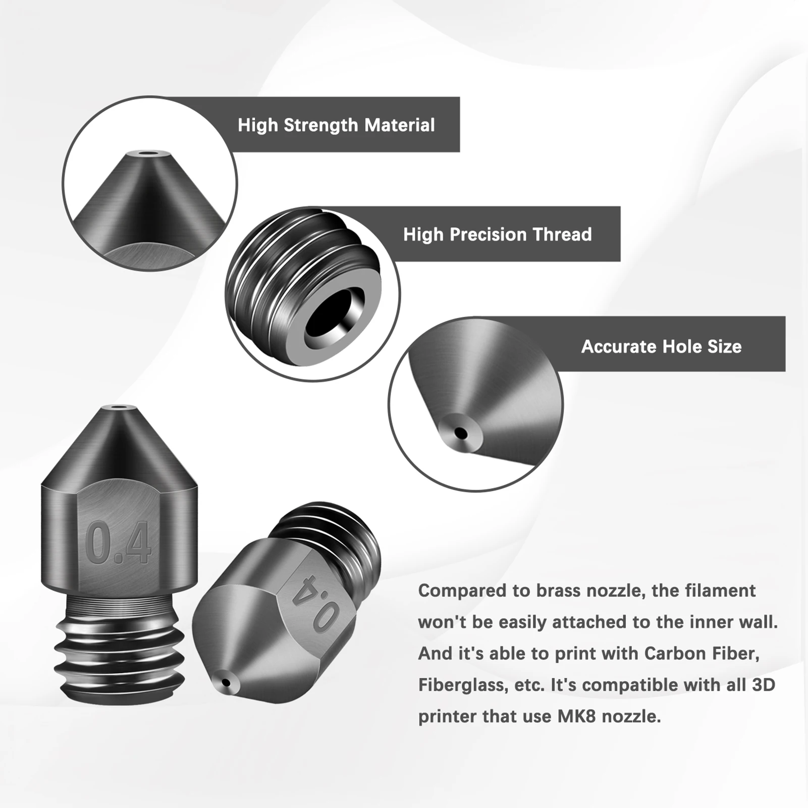 Что вы получаете: 6 шт. 0,4 мм закаленные Сталь MK8 сопла.