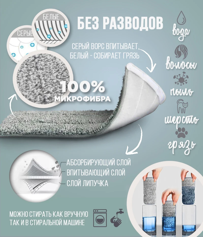 Nozzle for Mop Mop perfectly absorbs and keeps water! Up to 75% is better than it does cotton.