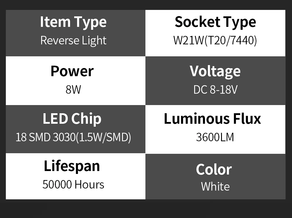 Посылка включает в себя: 2 светодиодных лампы заднего хода