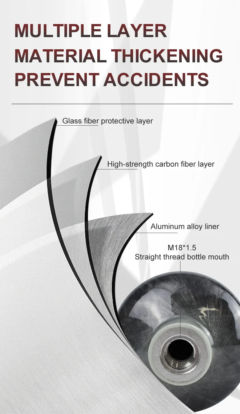 Фактический объем: 0,7 (л)Длина: 400 ммДиаметр: 60-61 ммВнешний диаметр: 61,5 мм (макс.)Фактический Вес: 0,65 (кг)Отверстие для бутылки с прямой резьбой: M18 * 1,5Рабочее давление: 300 барГидравлическое испытательное давление: 500 барСрок службы дизайна: 15 летМатериал волокна: углеродный волокнистый материалМатериал: 6061 алюминиевый сплав