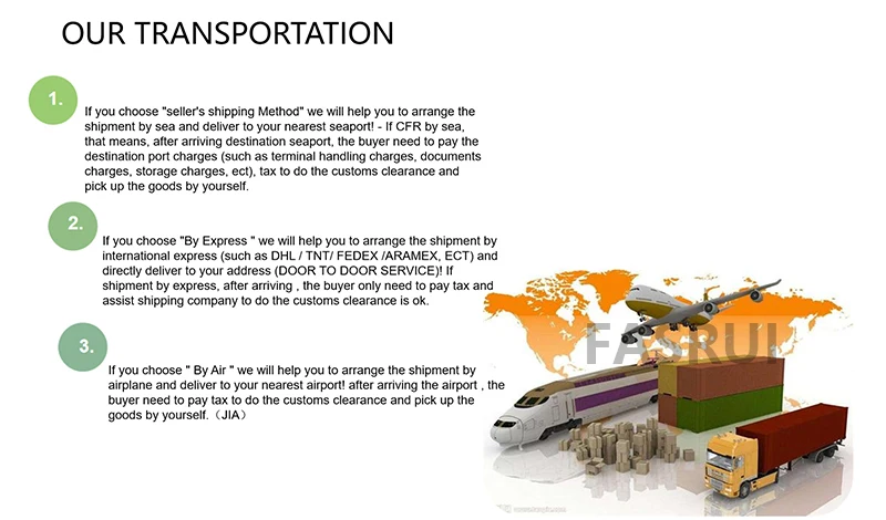 2. Если вы выберете «экспресс», мы поможем вам организовать доставку международной экспресс-почтой (например, DHL / TNT/ FEDEX /ARAMEX и т. Д.) И непосредственно доставляем по вашему адресу (от двери до двери)! При отправке экспресс-почтой, после прибытия, покупатель должен только оплатить налог и помочь транспортной компании, чтобы сделать таможенное оформление в порядке.