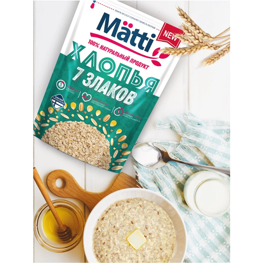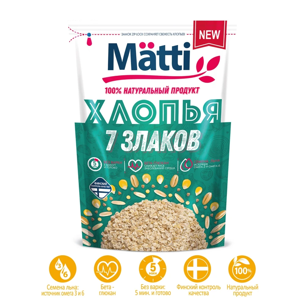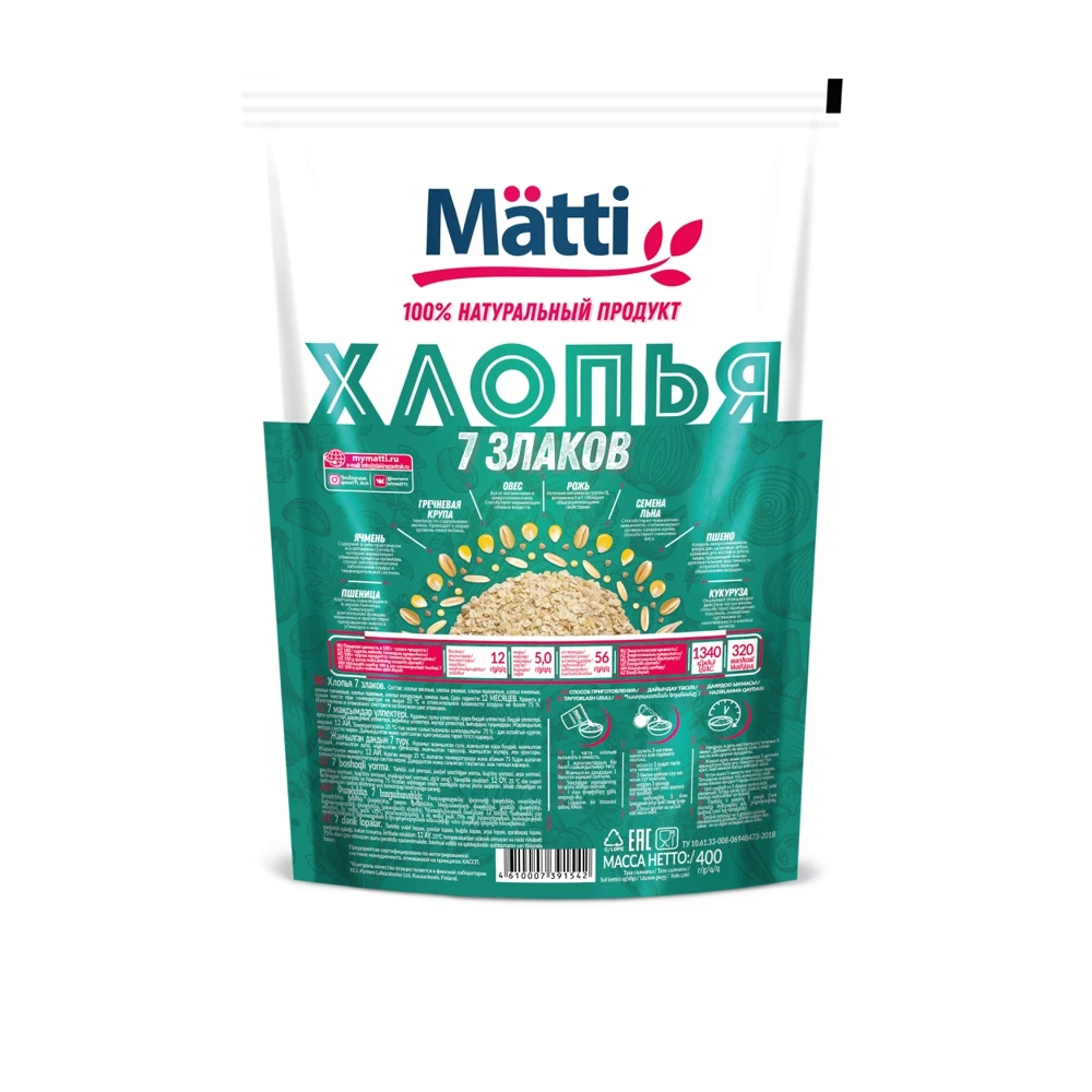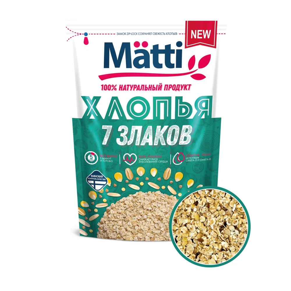Хлопья Matti 7 злаков - это кладезь пользы, мультизлаковая смесь из специально подобранного соотношения компонентов: овес, пшеница, рожь, кукуруза, семена льна, ячмень, гречневая крупа, пшено. Каша из хлопьев Matti 7 злаков станет полезным и сбалансированным завтраком для начала эффективного дня. Способ приготовления 1 часть хлопьев высыпать в емкость, залить 3 частями горячей воды или горячего молока, накрыть и дать настояться в течение 5 минут, добавить по вкусу соль, сахар, масло или другие продукты.