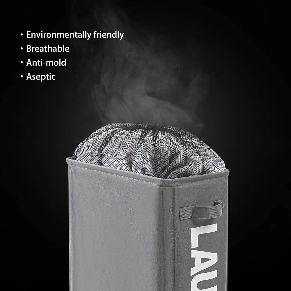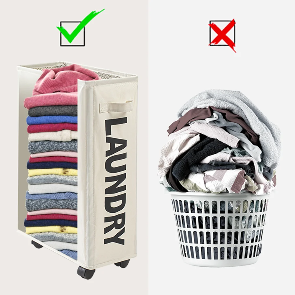 Узкая корзина для белья, можно разместить в любом уголке дома.