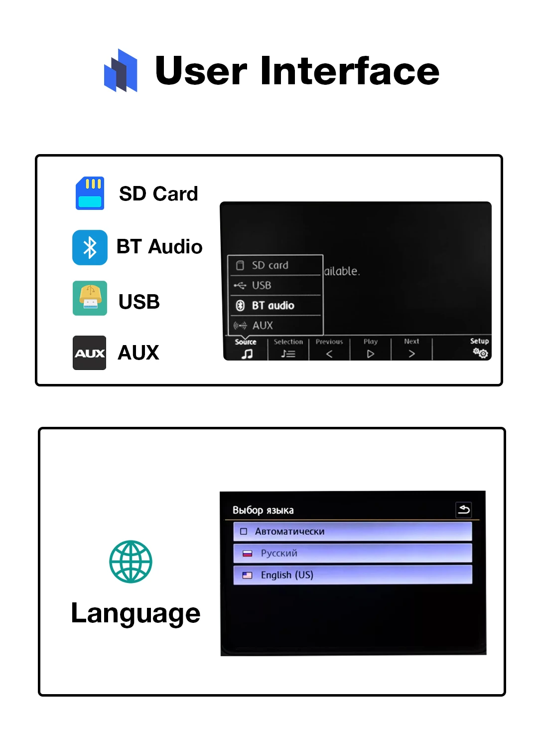-Поддержка Bluetooth ,USB ,AUX, sd-карты, OPS, камеры (только AV камера).