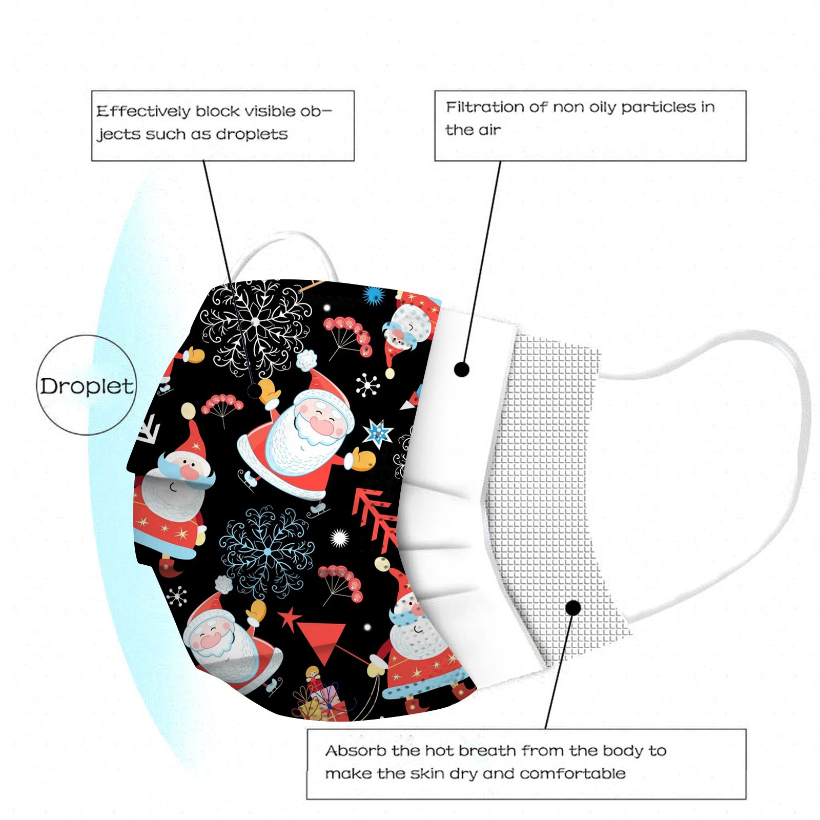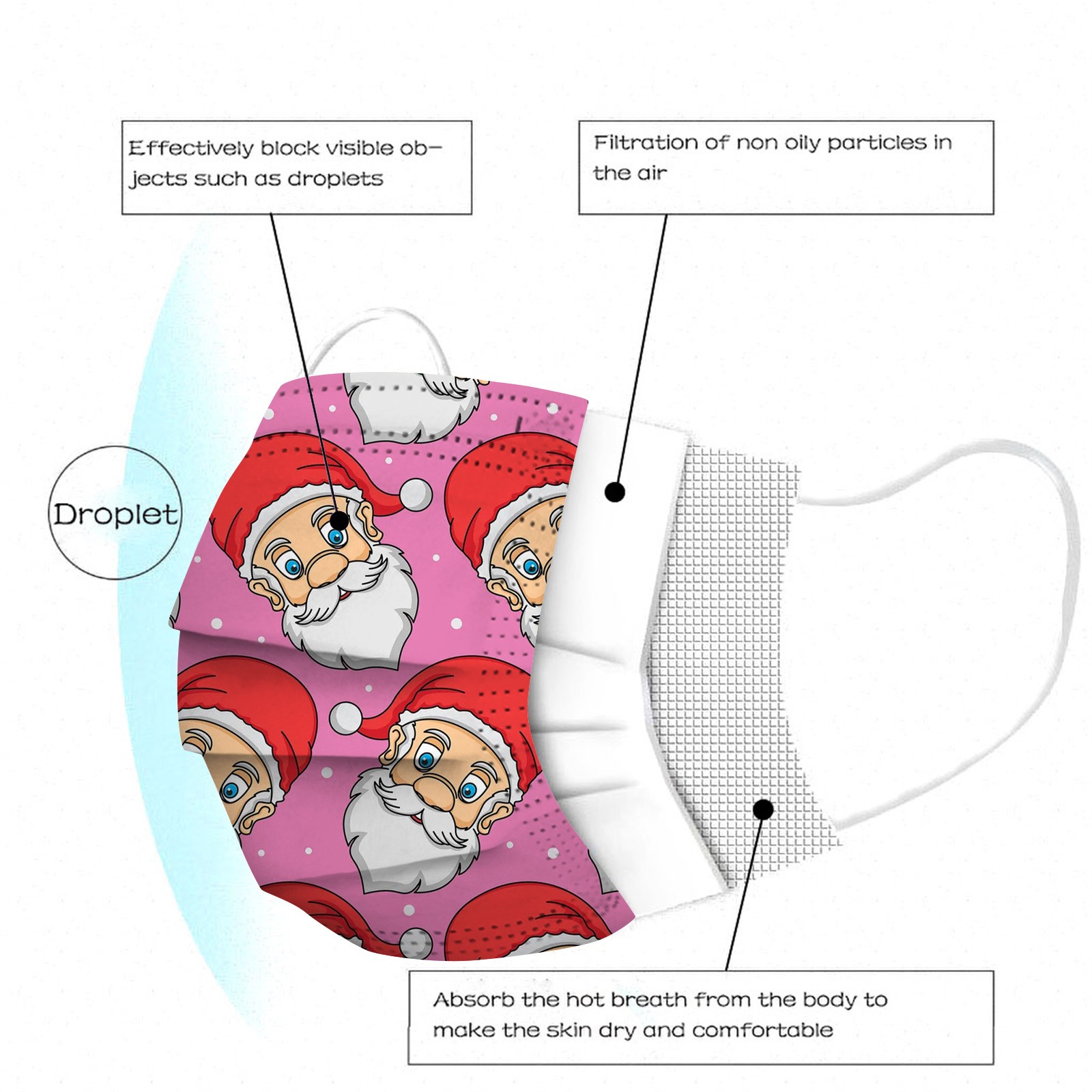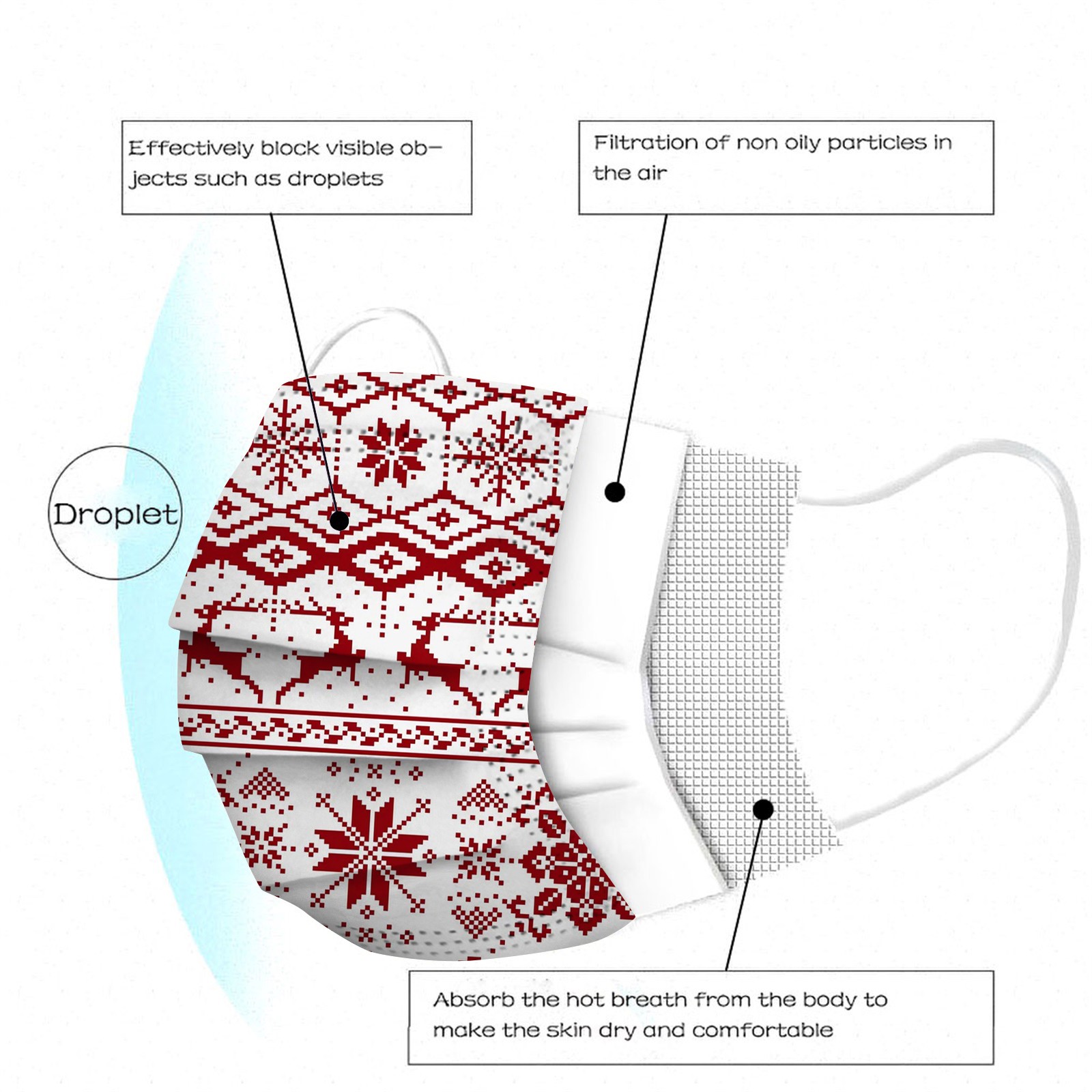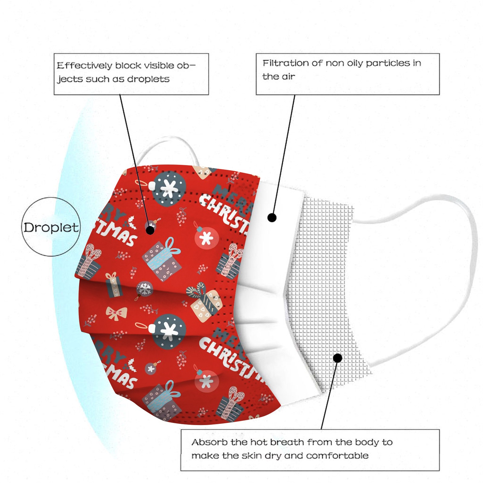 Маска для лица, три слоя защиты, изготовлен из фильтрующего слоя расплава и нетканого материала. Рождественская одноразовая маска для лица, поверхность равномерно покрыта воздушными порами, хорошая воздухопроницаемость. Рождественская маска, Регулируемый мягкий зажим для носа лучше подходит для лица. Предоставляя вам удобство при ношении. Одноразовые маски для лица, дышащее пространство, которое отвечает потребностям различных контуров лица и может использоваться взрослыми. Рождественская маска для лица, подходит для большинства общественных мест и обеспечивает защиту вашего путешествия.Товары включают: