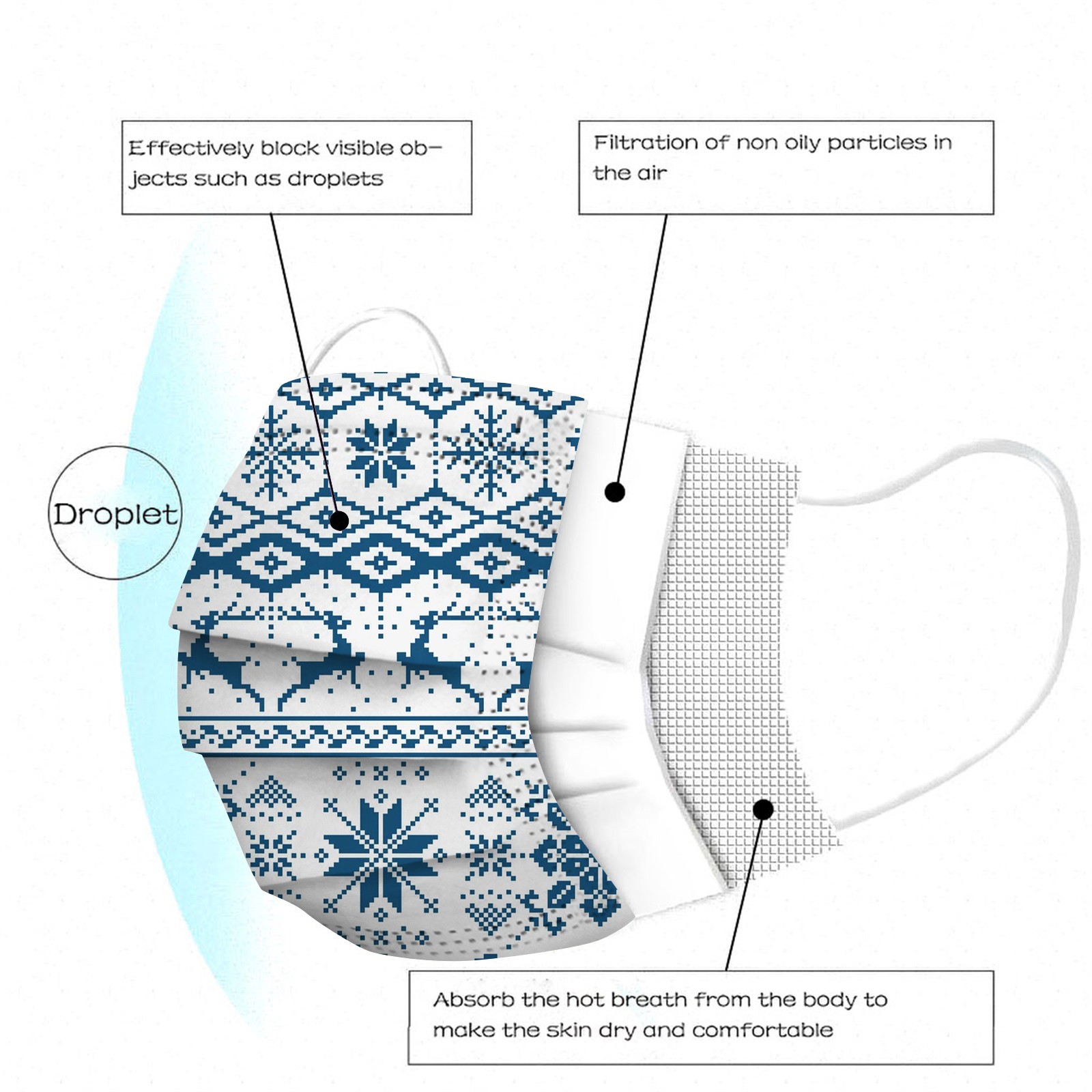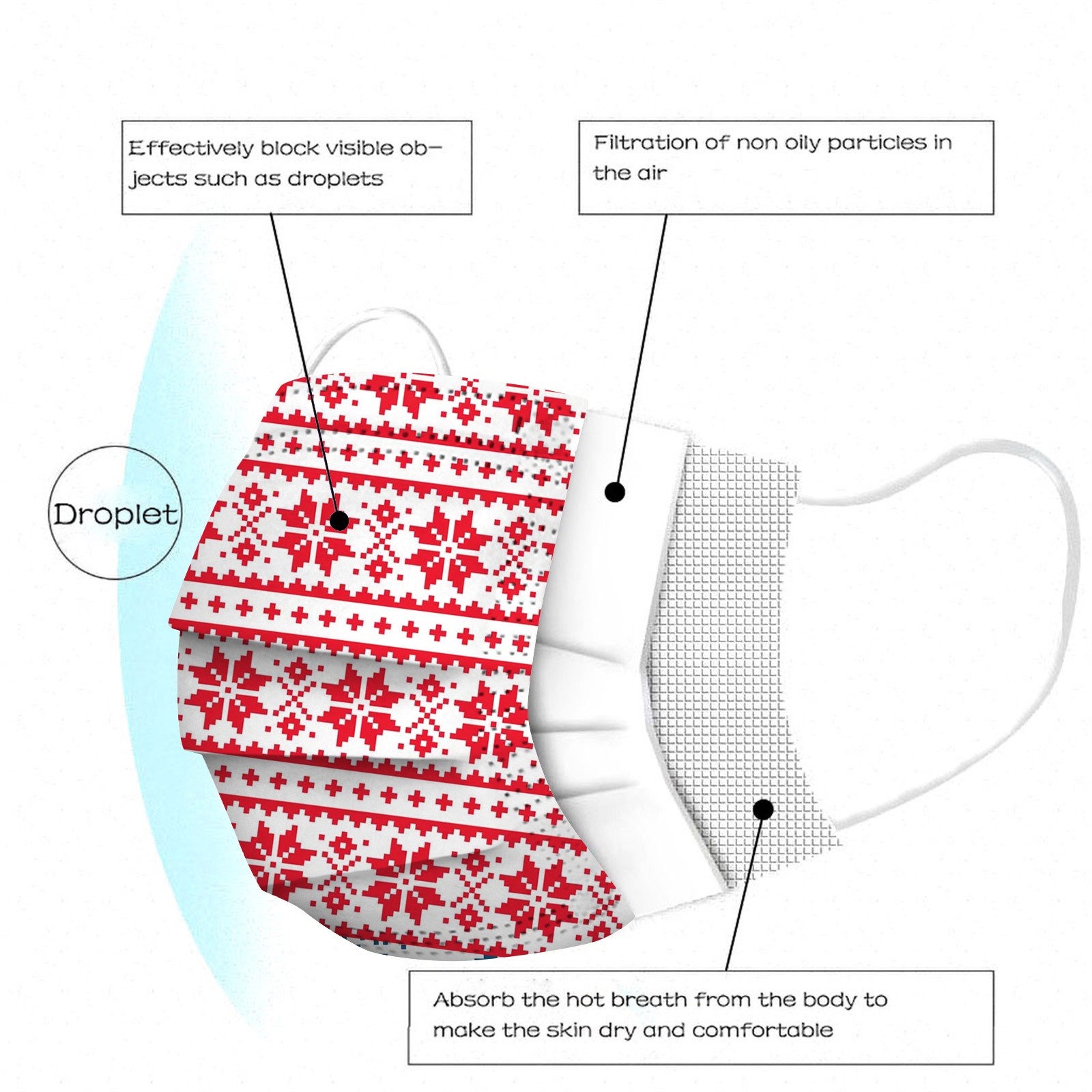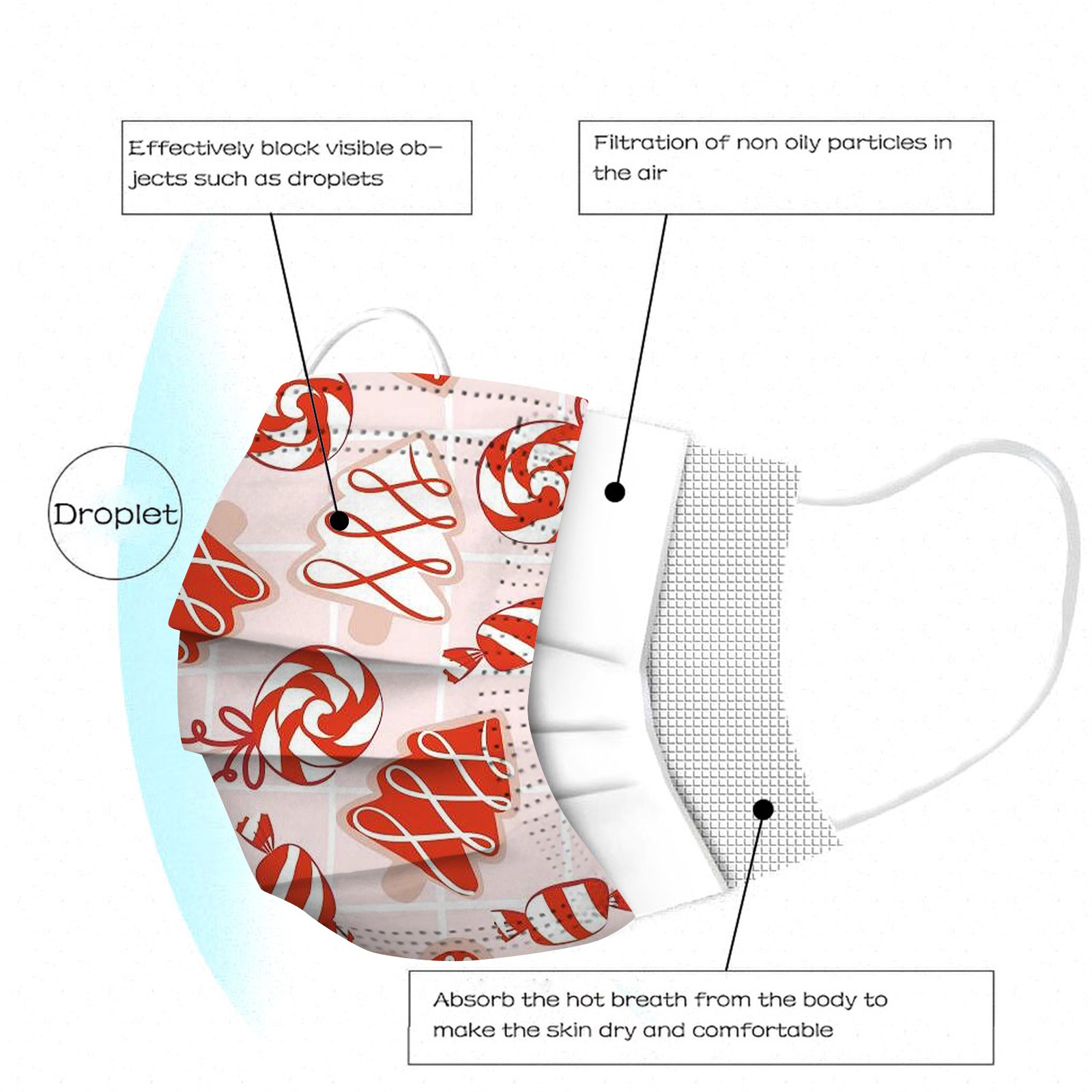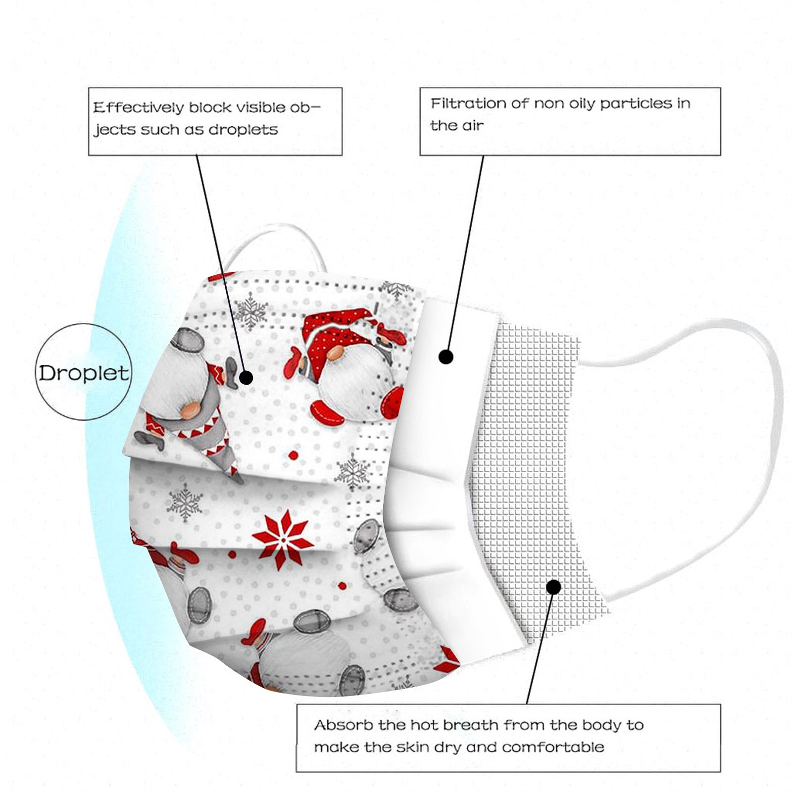 Маска для лица, три слоя защиты, изготовлен из фильтрующего слоя расплава и нетканого материала. Рождественская одноразовая маска для лица, поверхность равномерно покрыта воздушными порами, хорошая воздухопроницаемость. Рождественская маска, Регулируемый мягкий зажим для носа лучше подходит для лица. Предоставляя вам удобство при ношении. Одноразовые маски для лица, дышащее пространство, которое отвечает потребностям различных контуров лица и может использоваться взрослыми. Рождественская маска для лица, подходит для большинства общественных мест и обеспечивает защиту вашего путешествия.Товары включают: